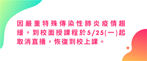 5/25(一)起到校面授課程取消直播上課,恢復到校面授。