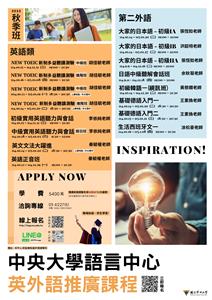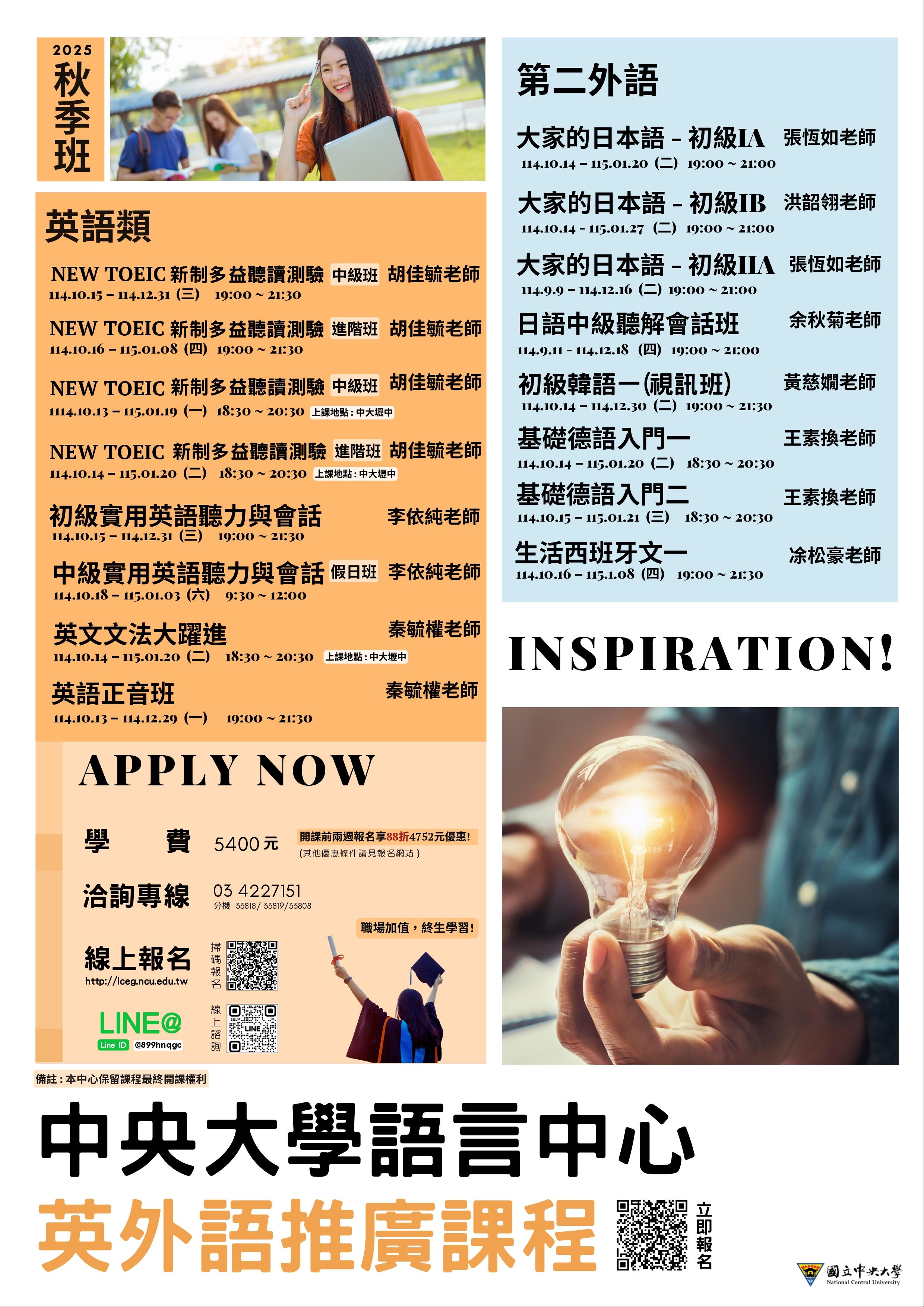 二、國立中央大學語言中心自114年10月起,精心規劃多門英語及第二外語非學分推廣教育課程,內容實用多元,適合提升語言能力與職場競爭力。