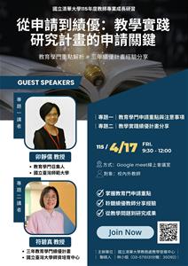 主旨:國立清華大學謹訂於115年4月17日舉辦「從申請到績優:教學實踐研究計畫的申請關鍵」線上研習,敬邀貴校教師踴躍參與,請查照。