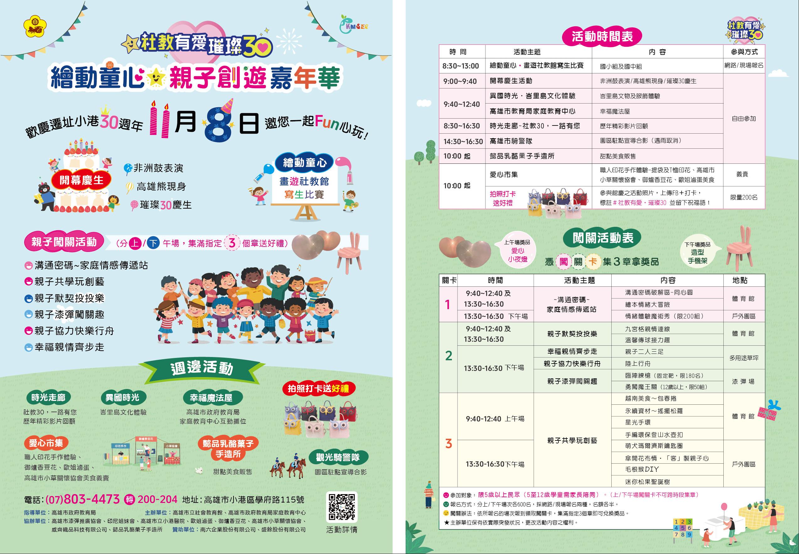 一、活動目的:高雄市立社會教育館自84年10月遷址至小港,為歡慶30週年特舉辦開幕慶生、寫生比賽、親子闖關、愛心市集等多元活動,邀請市民朋友共同見證與分享喜悅。