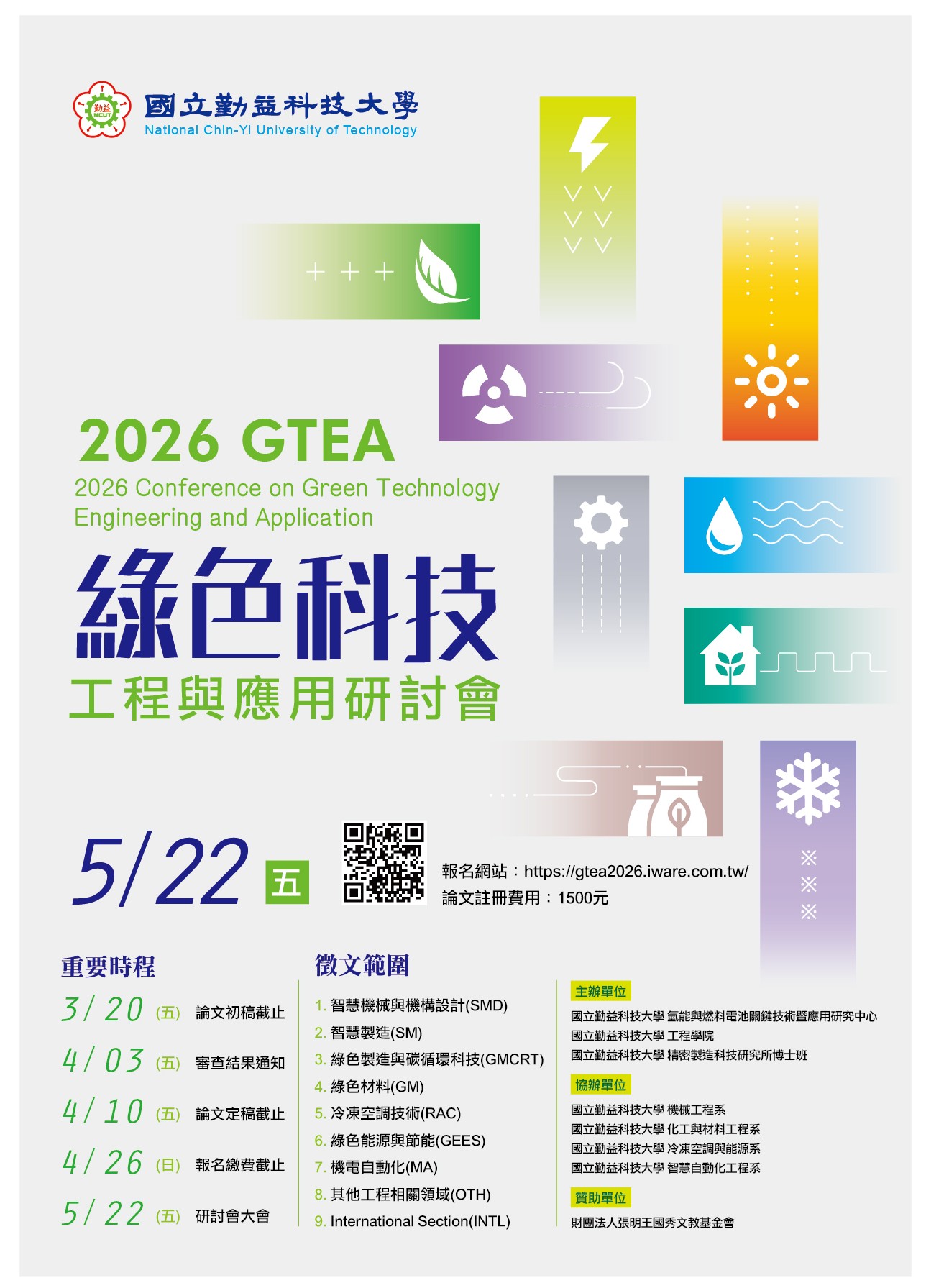 【轉知】檢送國立勤益科技大學工程學院辦理2026GTEA綠色科技工程與應用研討會海報乙份,請惠予轉知並鼓勵師生踴躍投稿