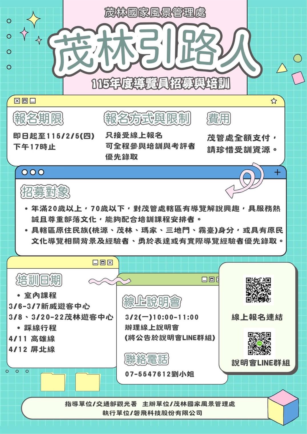 二、檢送旨揭招募簡章及海報各1份,並請逕至本處官網公告區 下載或逕行填報報名表:https://reurl.cc/3bQMj0,招募 人數有限,額滿為止,相關問題請洽本處(07)687-1234 分機246,邱小姐。一、為提升本轄區及接待服務品質,自即日起辦理115年度導覽 解說志工招募,報名期限至115年2月5日止,僅接受線上報 名。