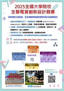 三、活動內容:本屆特將賽事擴大為「全國大學院校生醫電資創新設計競賽」,期能匯聚全國青年學子的創新思維,為我國生醫領域注入新活力。