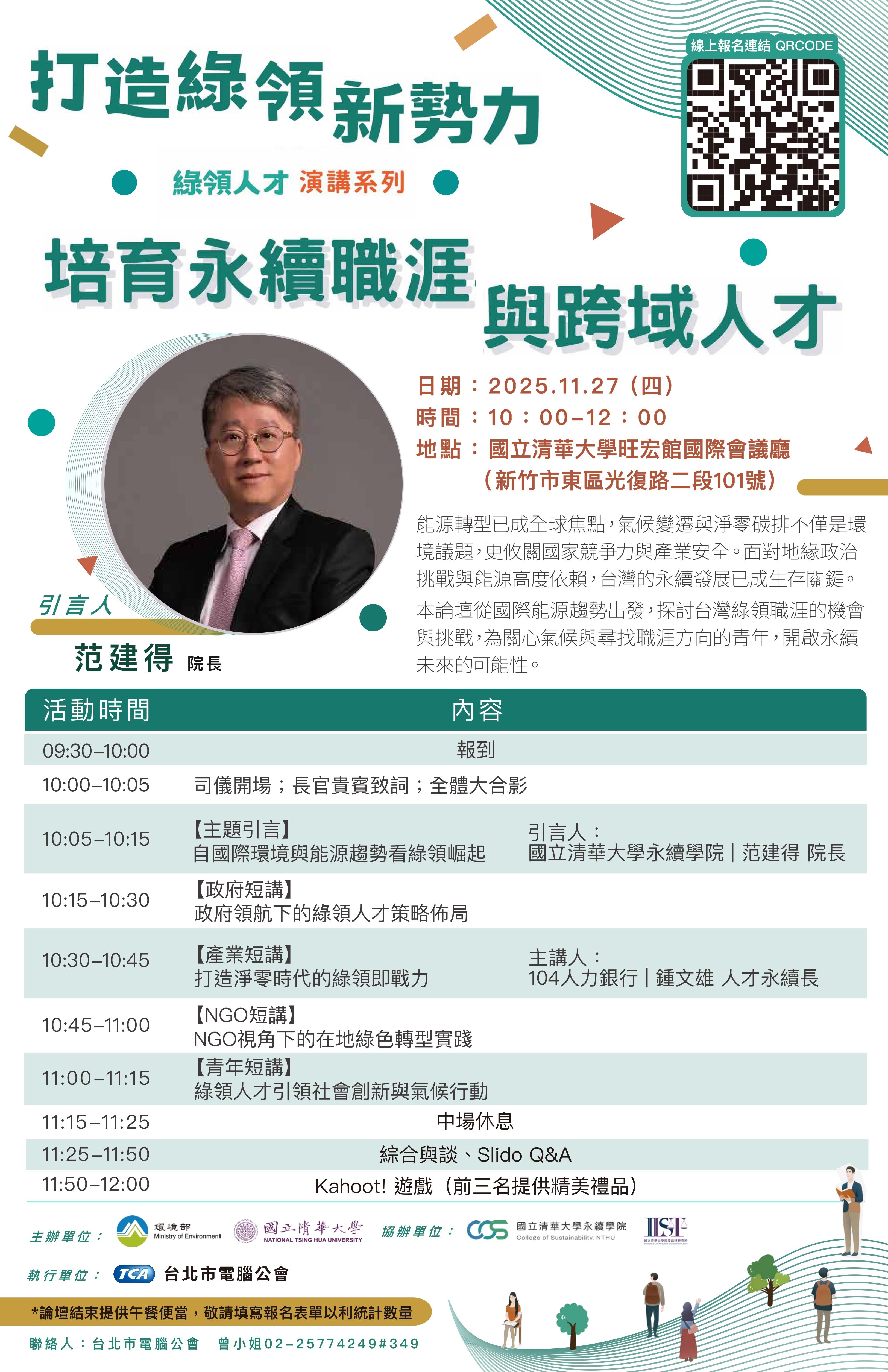 二、活動介紹:本次論壇將以國際能源趨勢為起點,帶大家一同探索台灣在能源轉型下的「綠領職涯」新契機。從科技創新到社會實踐,讓參與者認識綠領人才如何成為推動永續變革的關鍵力量。