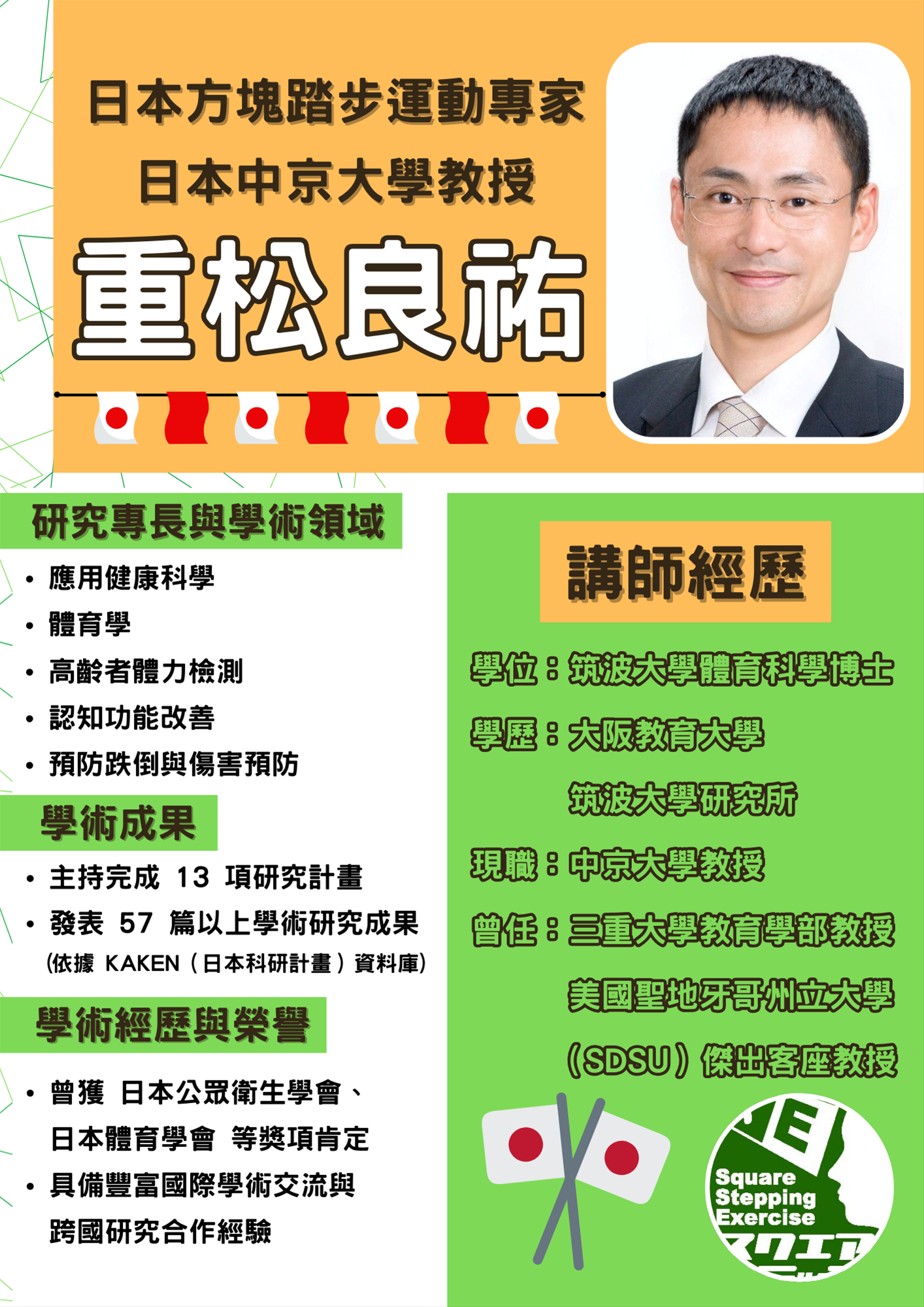 三、講師介紹:本次講習會邀請日本中京大學運動科學部重松良祐教授親自來台授課,適合對高齡運動、預防跌倒有興趣之師生。