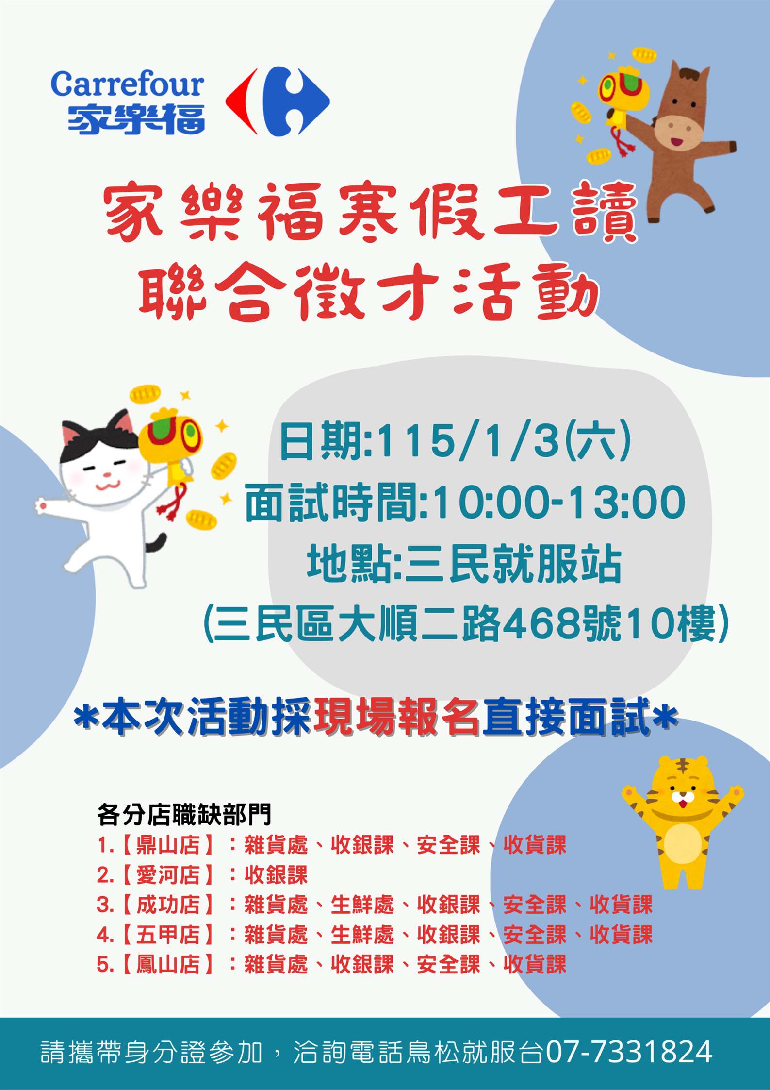 一、為協助青年及求職民眾就業,本中心訂於明(115)年1月3日 (六)10時至13時於本中心三民就業服務站(三民區大順二 路468號10樓)辦理「家樂福寒假工讀生單一徵才活 動」。 二、敬請貴校協助運用學校網站、電子郵件或跑馬燈等方式, 宣傳活動訊息,鼓勵應屆畢業生、在校學生、畢業校友及 家長參加,俾協助就業。 三、如對活動有任何疑問,可洽本案活動承辦人顏小姐,聯絡 電話:(07)7331824。