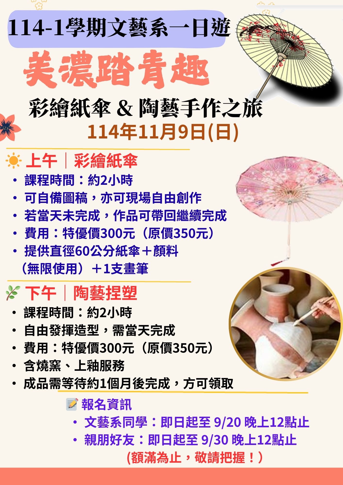 文藝系訂於114年11月9日(日),舉辦本系「114-1學期美濃踏青趣、彩繪紙傘 & 陶藝手作之旅之旅」活動。此次活動參訪充滿人文風情的美濃聚落,透過「彩繪紙傘」與「陶藝捏塑」,體驗手作藝術的樂趣與溫度,結合自然、文化與創作的旅程,讓學生能更深入體認文化藝術之美,提升自身對文化藝術的認知,達到學習之目的。