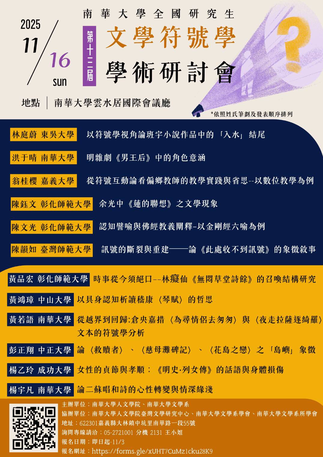 轉知南華大學文學系舉辦「南華大學全國研究生第13屆文學符 號學研討會」活動海報1份,敬請惠予公告並鼓勵參加, 請查照。