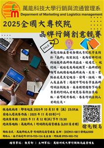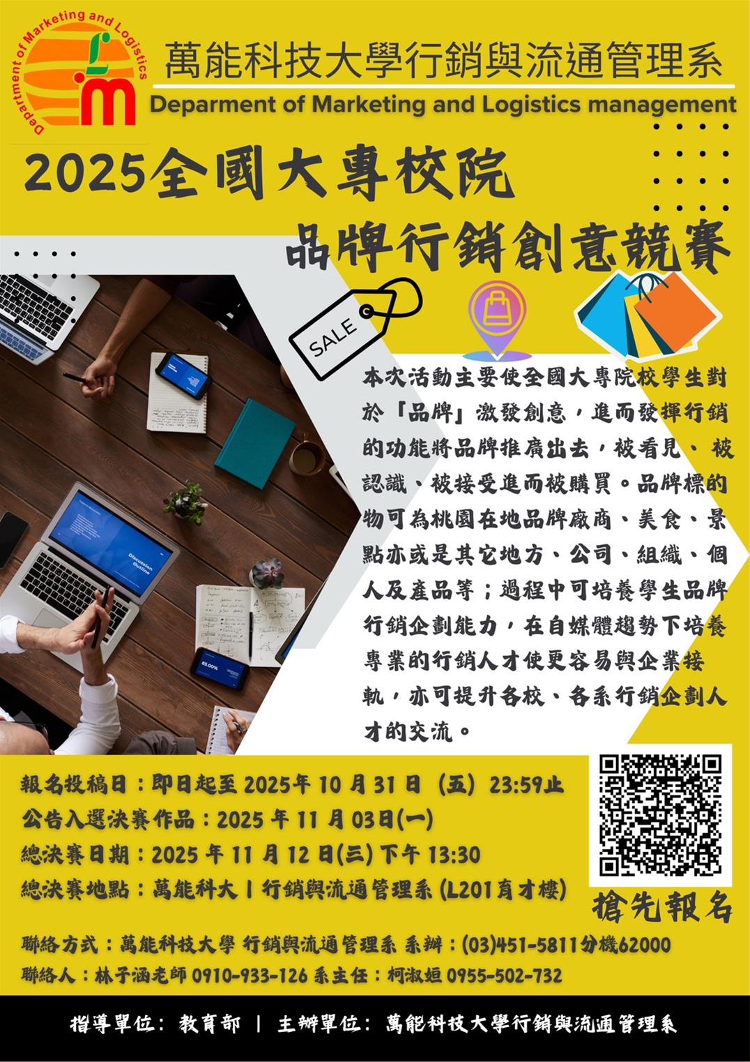一、主辦單位:萬能科技大學 行銷與流通管理系 二、報名及投稿日期:即日起至2025年10月31日(五)23時59分止 三、報名方式:線上報名(請點選下方─相關連結) 四、公告入選決賽作品:2025年11月03日(一)。 五、總決賽日期:2025年11月12日(三)下午13時30分。