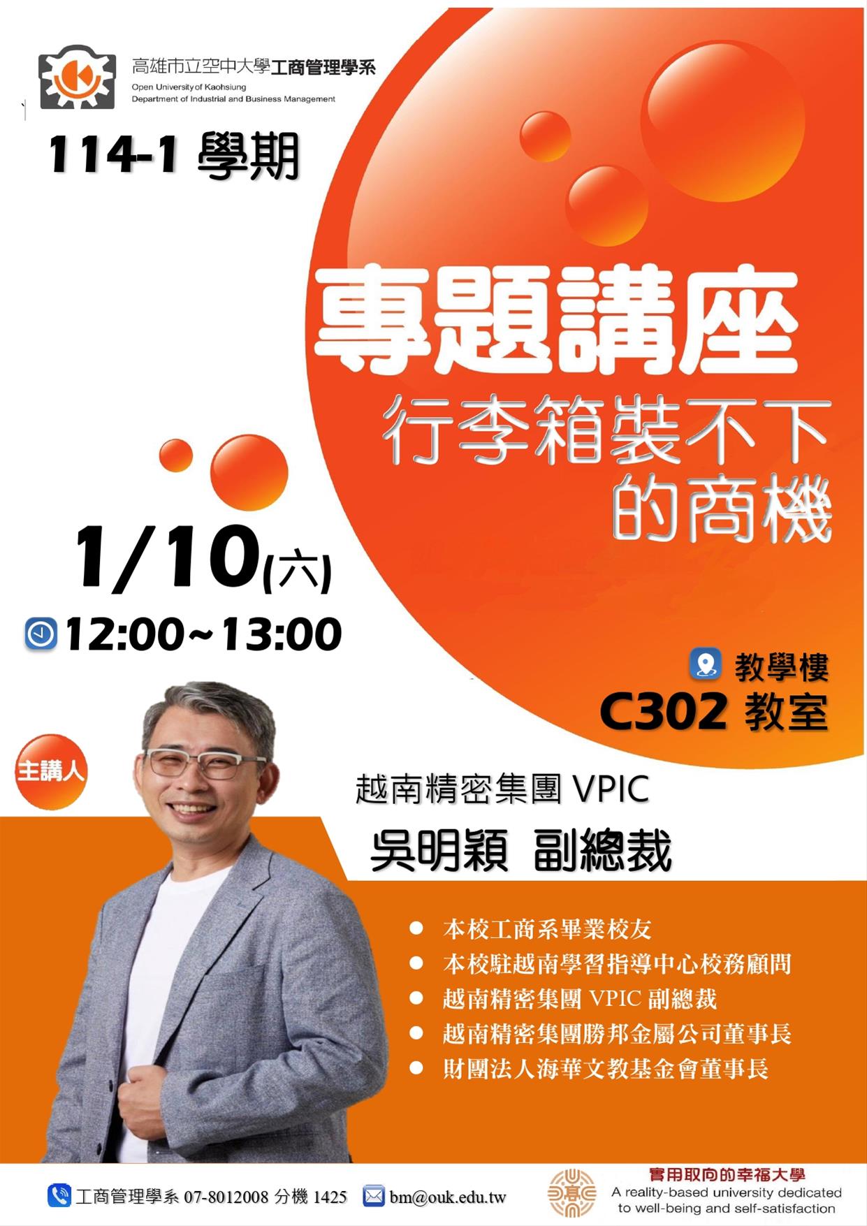 活動特別邀請本系傑出校友--現任越南精密集團及海華文教基金會的吳明穎董事長來為同學分享「行李箱裝不下的商機-越南生活與創業分享」,歡迎有興趣的同學踴躍報名參加。