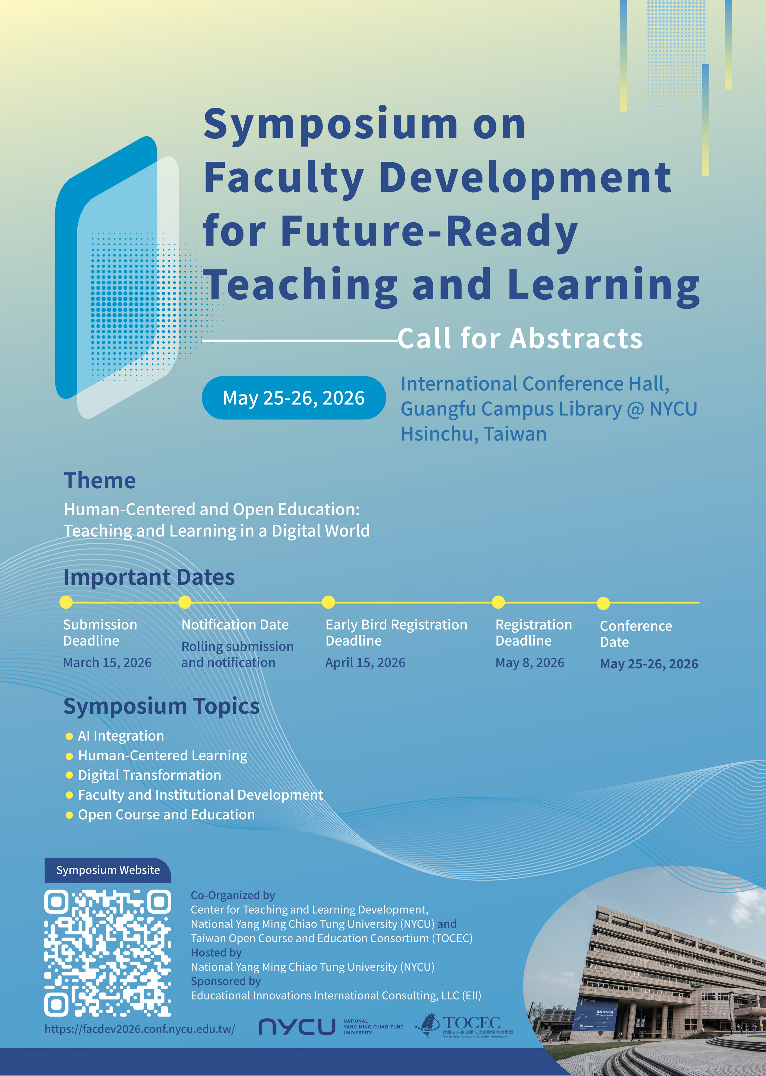 【轉知】社團法人臺灣開放式課程暨教育聯盟謹訂於115年5月25-26日舉辦「Symposium on Faculty Development for Future-Ready Teaching and Learning」國際研討會,訊息詳如說明