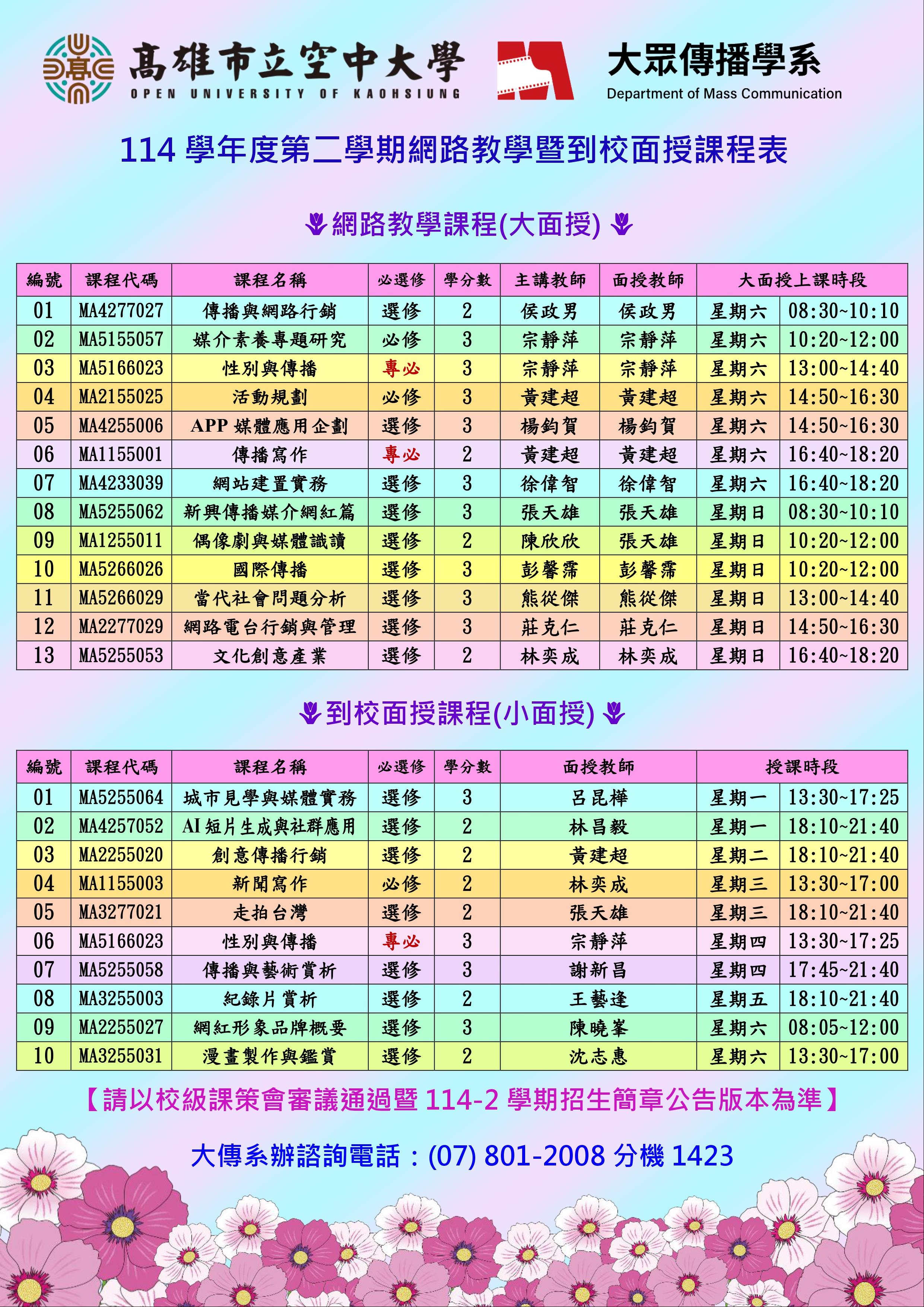 【大眾傳播學系】114-2學期課程-教師說明影片; 熱燙燙出爐囉!!快來一探究竟~~ 為使同學們能更加瞭解,大傳系豐富有趣的授課內容~ 系上教師們用心錄製114-2學期課程說明影片(如下附檔),或提供相關課程資訊予同學們參考。 誠摯歡迎各位同學,請撥空點選以下連結觀看~~ 並請把握時間選課您有興趣的課程,敬祝各位同學學習愉快!!