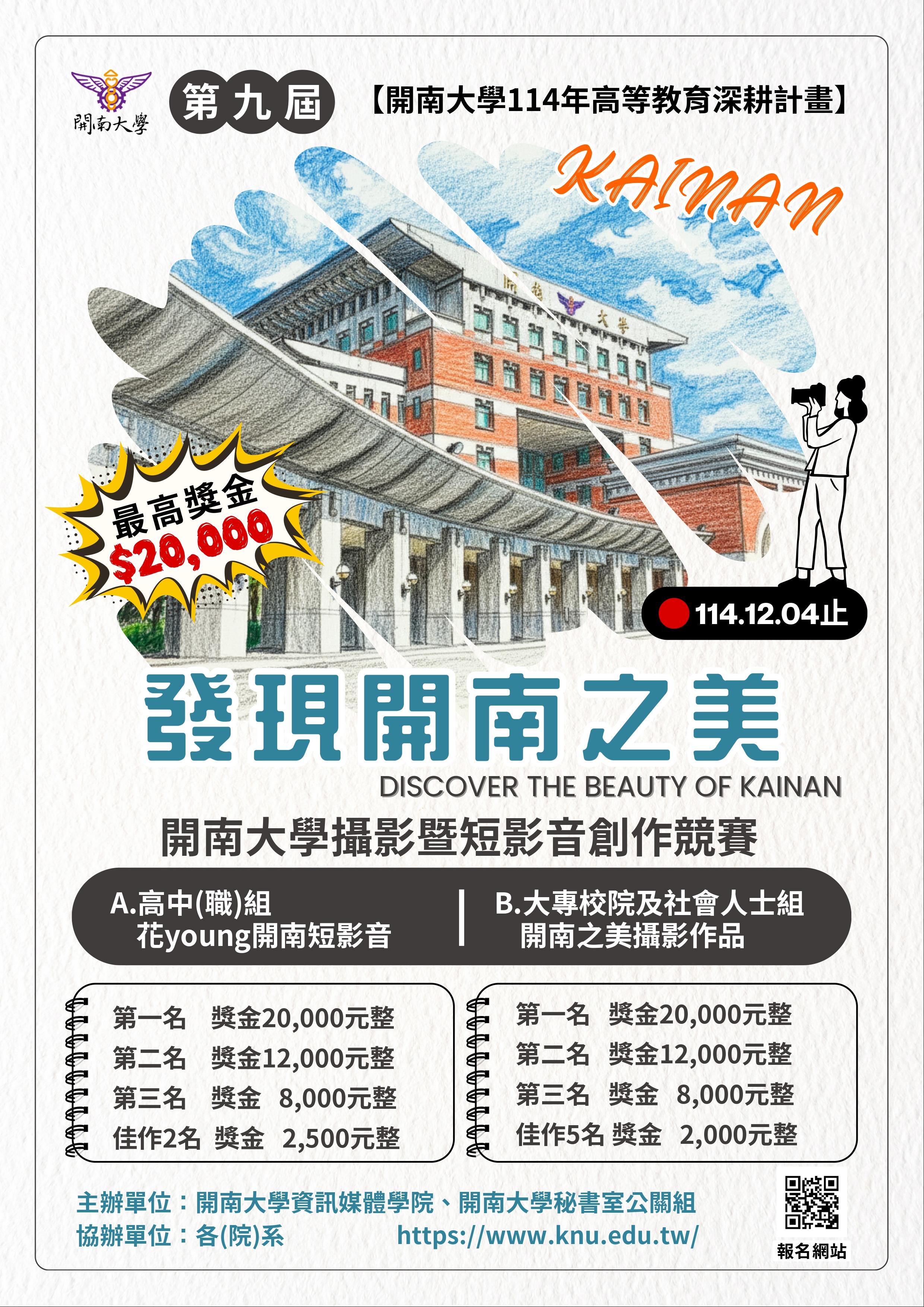 二、活動目的:係配合開南大學114年度高等教育深耕計畫辦理,藉由攝影與短影音創作,鼓勵青年學子及社會人士以影像記錄開南與地方之美,展現創意與多元文化風貌。