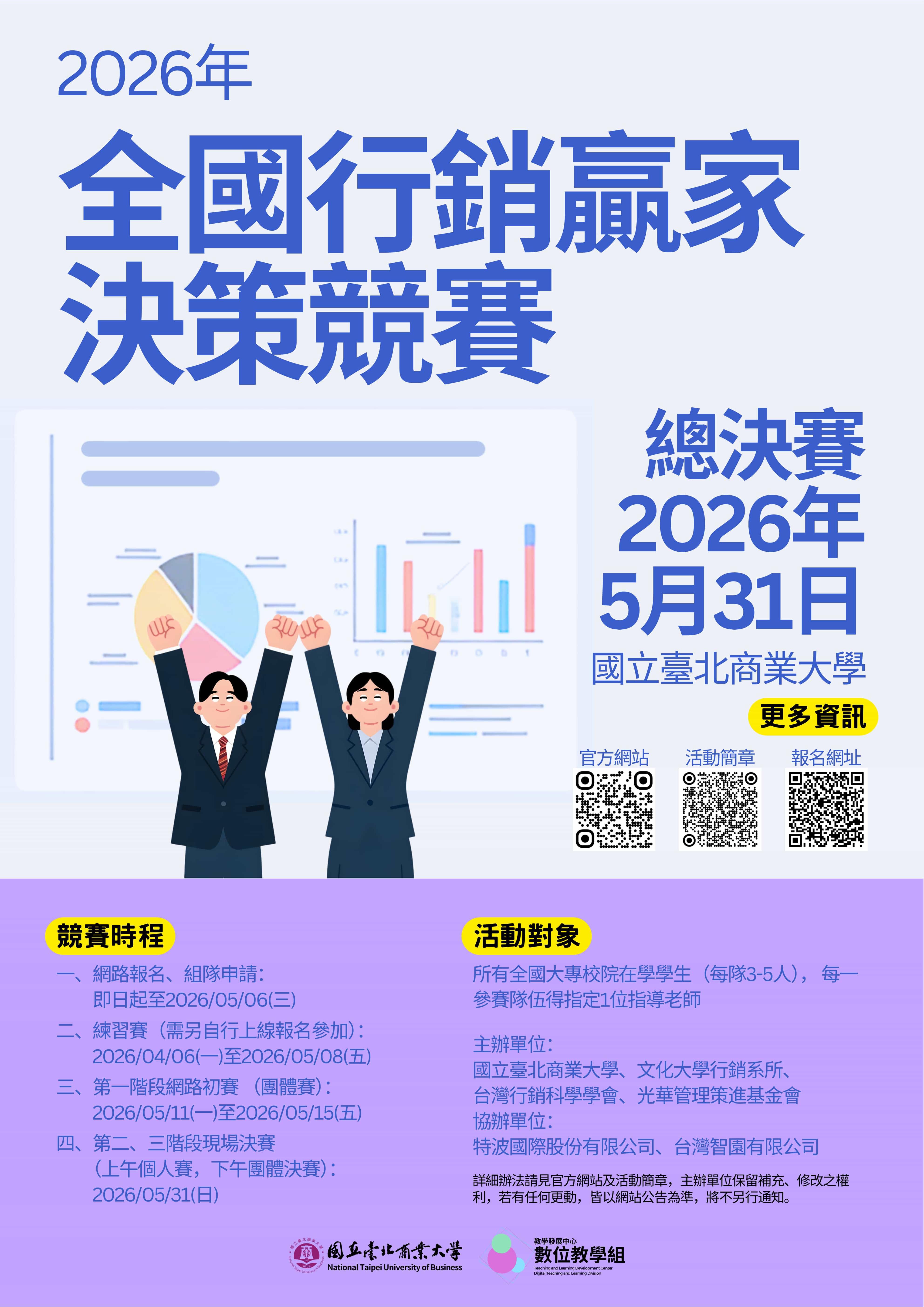 二、活動宗旨:現階段的商管教育除了傳統理論及個案教學外,透過經營模擬的電腦系統來進行練習和競賽,已是全球商管領域的熱門學習模式。特舉辦「2026全國行銷贏家決策競賽」,提倡經營模擬電腦系統的教學,將課堂所學相關學科知識融會貫通,整合運用於決策制定上,培養學生獨立思考與群體決策能力。同時藉由各校學生的競賽交流過程,相互觀摩學習精進實力。