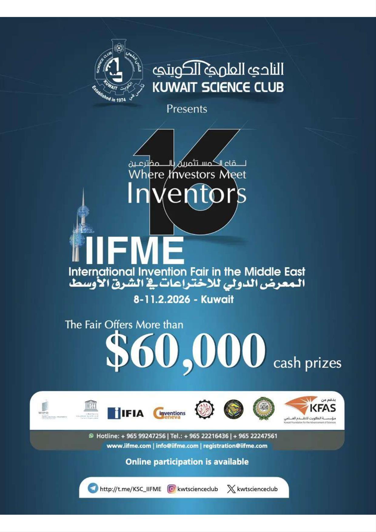 四、活動內容:第十六屆中東國際發明展(International Invention Fair in the Middle East, IIFME),此展為科威特國王皇室組織所支持的科威特科學俱樂部(Kuwait Science Club, KSC)主辦,已成為中東地區規模最大的發明展,並被譽為全球第二大發明展會。參展期間由大會招待發明人5晚Marriott Hotel 以及City Tour,貴賓有機會親身體驗科威特的文化。