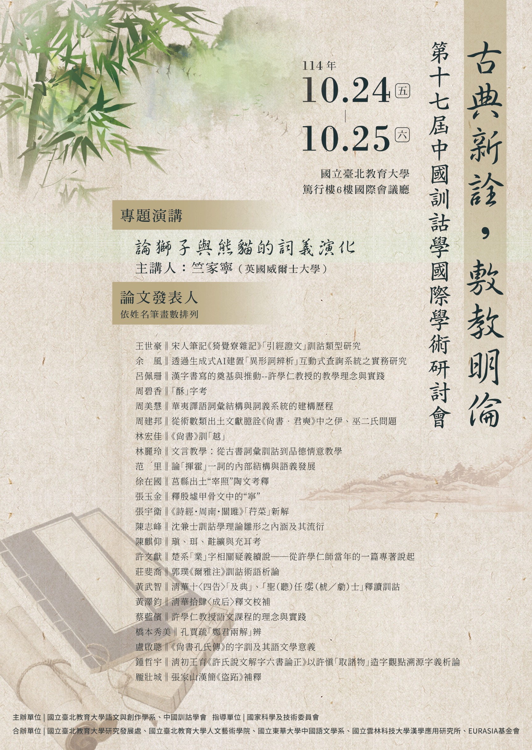 國立臺北教育大學語文與創作學系及中國訓詁學會共同舉辦「古典新 詮,敷教明倫——第十七屆中國訓詁學國際學術研討 會」,敬請惠予公告周知,並轉知貴屬鼓勵參加,請查 照。