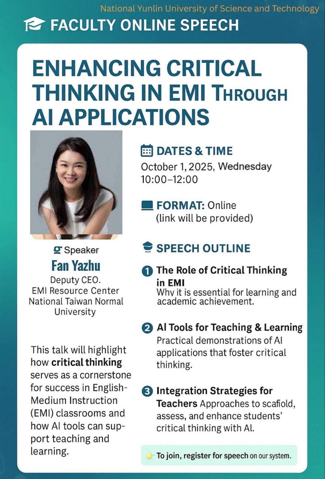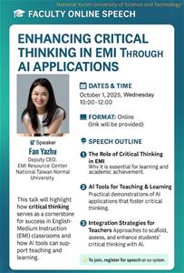 一、主辦單位:國立雲林科技大學 二、活動目的:為協助教師深入了解如何結合 AI 創新與 EMI 教學法,進一步提升學生的學習成效,特辦理本線上講座。 三、講座資訊如下: (一)時間:114年10月1日(星期三)上午10時至12時。 (二)報名網址:請點選下方─相關連結。 (三)報名截止日:114年9月30日(星期二)下午22時。