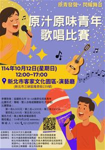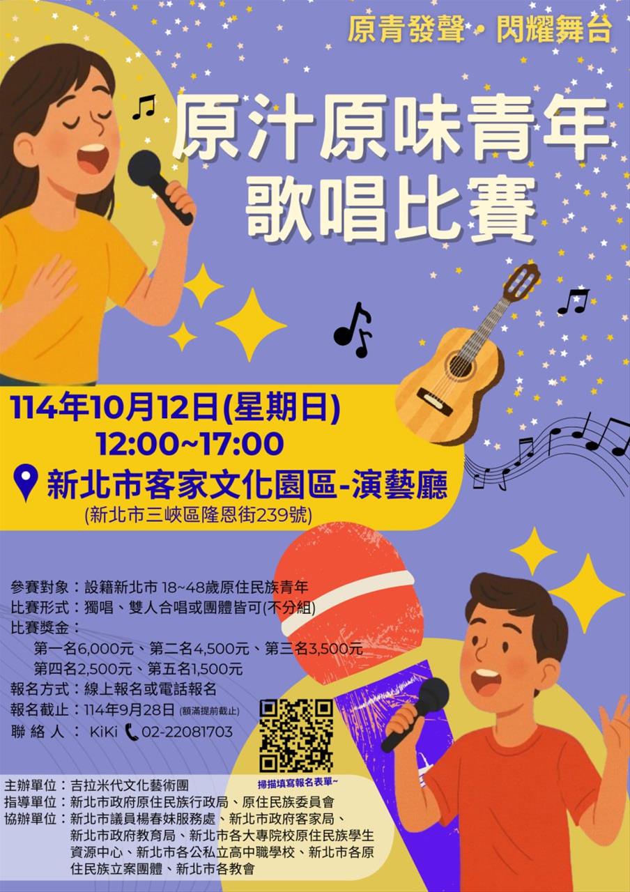 一、主辦單位:吉拉米代文化藝術團 二、活動時間地點如下: (一)活動時間:114年10月12日中午12時至下午5時。 (二)活動地點:新北市客家文化園區演藝廳。 三、參賽對象:設籍新北市18歲至48歲之原住民族青年。 四、報名日期:自即日起至114年9月28日,額滿提前截止。