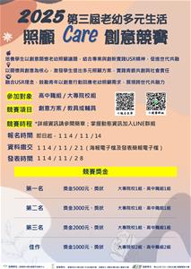 三、活動目的:樹德科技大學社會工作系辦理2025年第三屆老幼多元活動照顧Care創意競賽,鼓勵青年學子以創新構想與實際行動回應高齡者與幼兒在生活照顧上的多元需求,提出創新照顧方案或輔/教具發明,促進跨世代理解與社會共融,落實大學生關懷地方與實踐社會責任的行動力。
