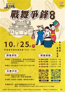 (3)比賽內容:每隊需演出指定曲(六堆客家戰舞)加自選曲(由隊伍自行準備)共2首,指定曲須採用主辦單位提供之音檔和指定動作,另可加入創意元素(如服裝、道具等),合計表演時間以6分鐘為限。