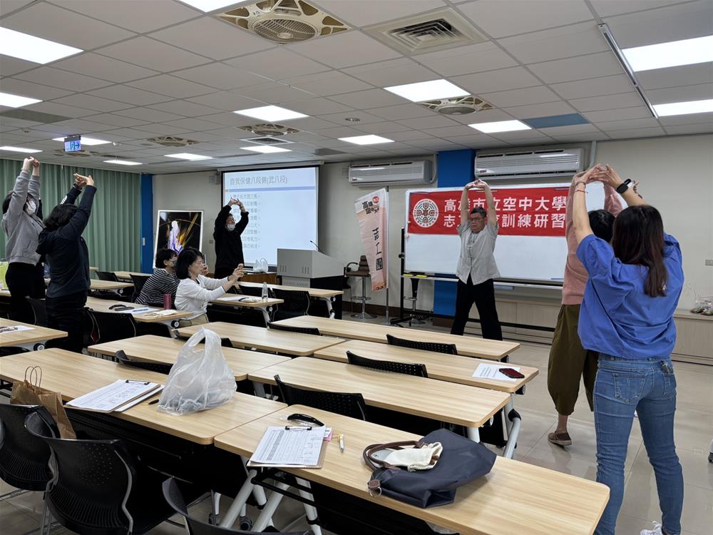本次講座由陳献堂老師進行健康保健專題分享,以深入淺出的方式介紹人體經絡原理,並示範多項實用的穴道按摩技巧,帶領學員現場實際操作,透過簡單的按壓與伸展動作,達到舒緩肩頸不適與放鬆身心的效果。此外,陳老師也指導學員練習傳統養生功法「八段錦」,藉由緩慢而協調的動作,幫助舒展筋骨、調節呼吸,提升自我保健意識。