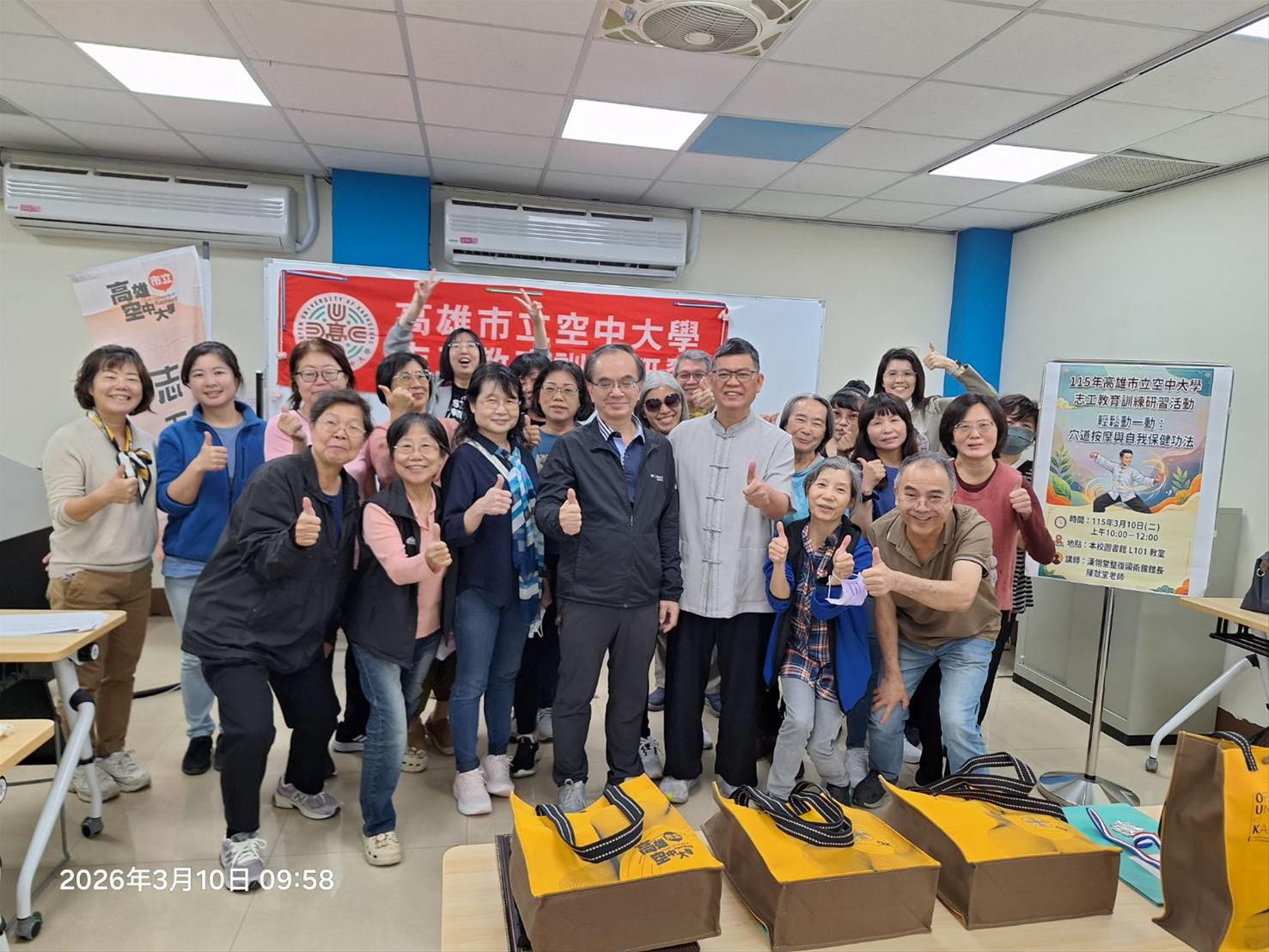 本校於115年3月10日上午假圖書館L101教室舉辦年度志工研習活動,特別邀請漢翎堂整復國術館館長陳献堂老師主講「輕鬆動一動:穴道按摩與自我保健功法」,吸引多位志工熱情參與,現場氣氛溫馨熱絡。