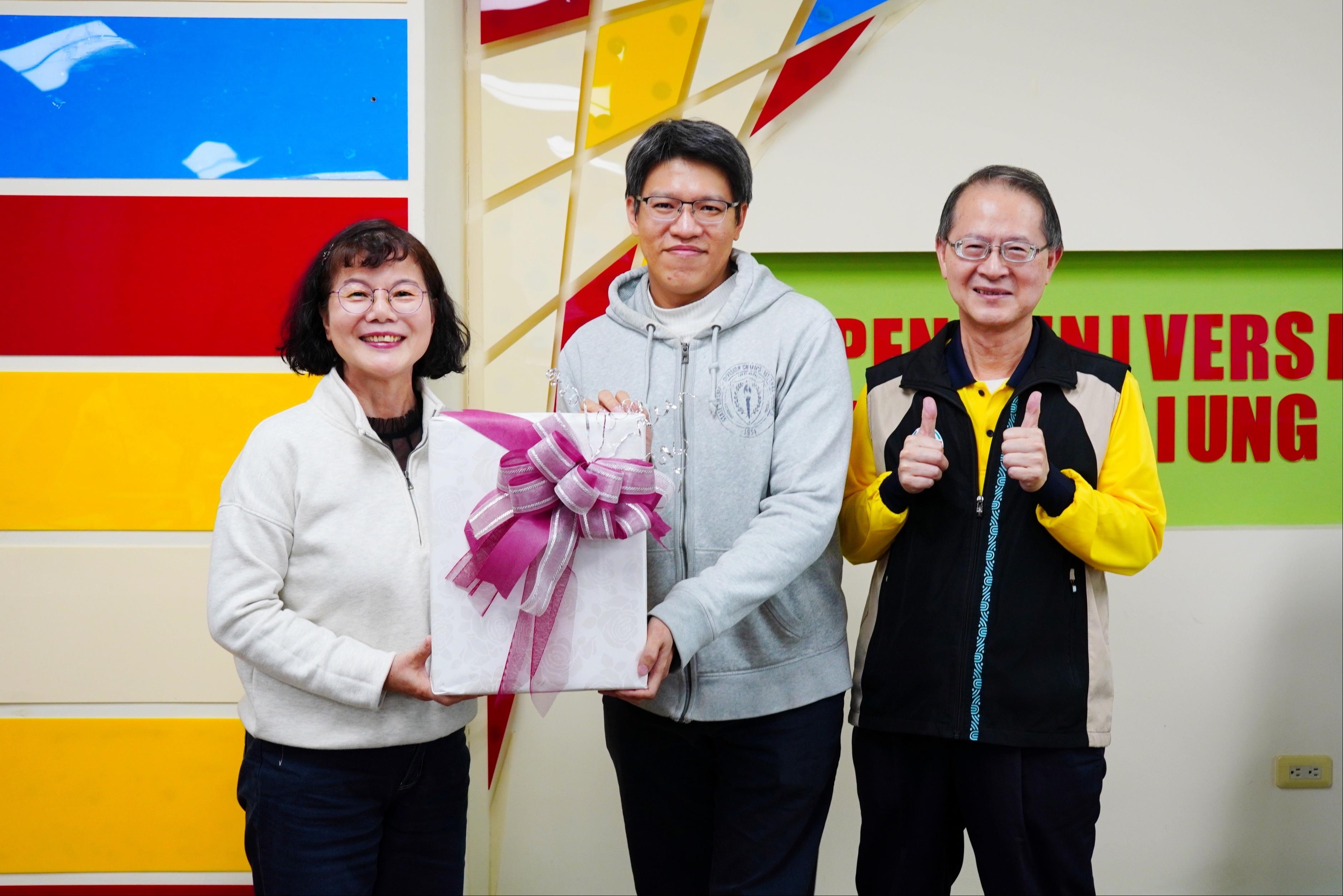 在行政會議中,陳月端校長特別致贈紀念禮品,感謝會計室蘇園淯組員多年來為校服務的辛勞與付出,並祝賀其榮陞會計主任,同時偕同本校會計主任葉展昌共同合影留念。