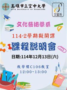 為加強學生對本系課程了解及認識,進而提升學生選課之意願,並由本系專、兼任教師介紹114-2學期開設課程特色,擬於114年12月13日(六)中午12:00~13:00,於本校教學大樓C106教室舉辦文藝