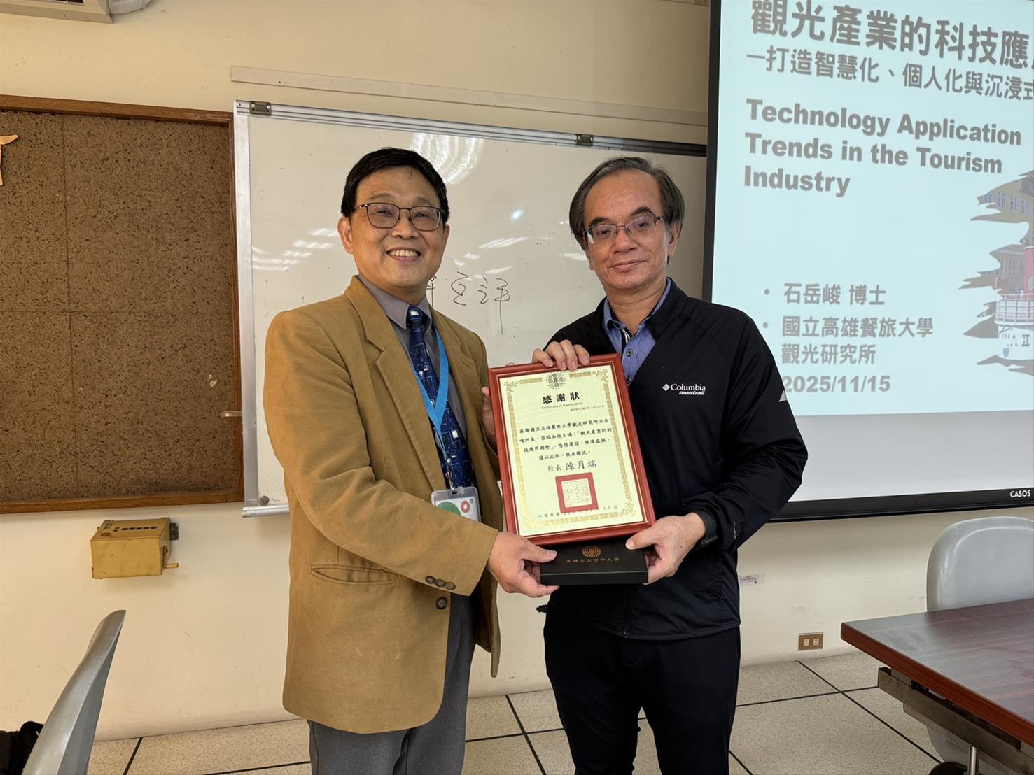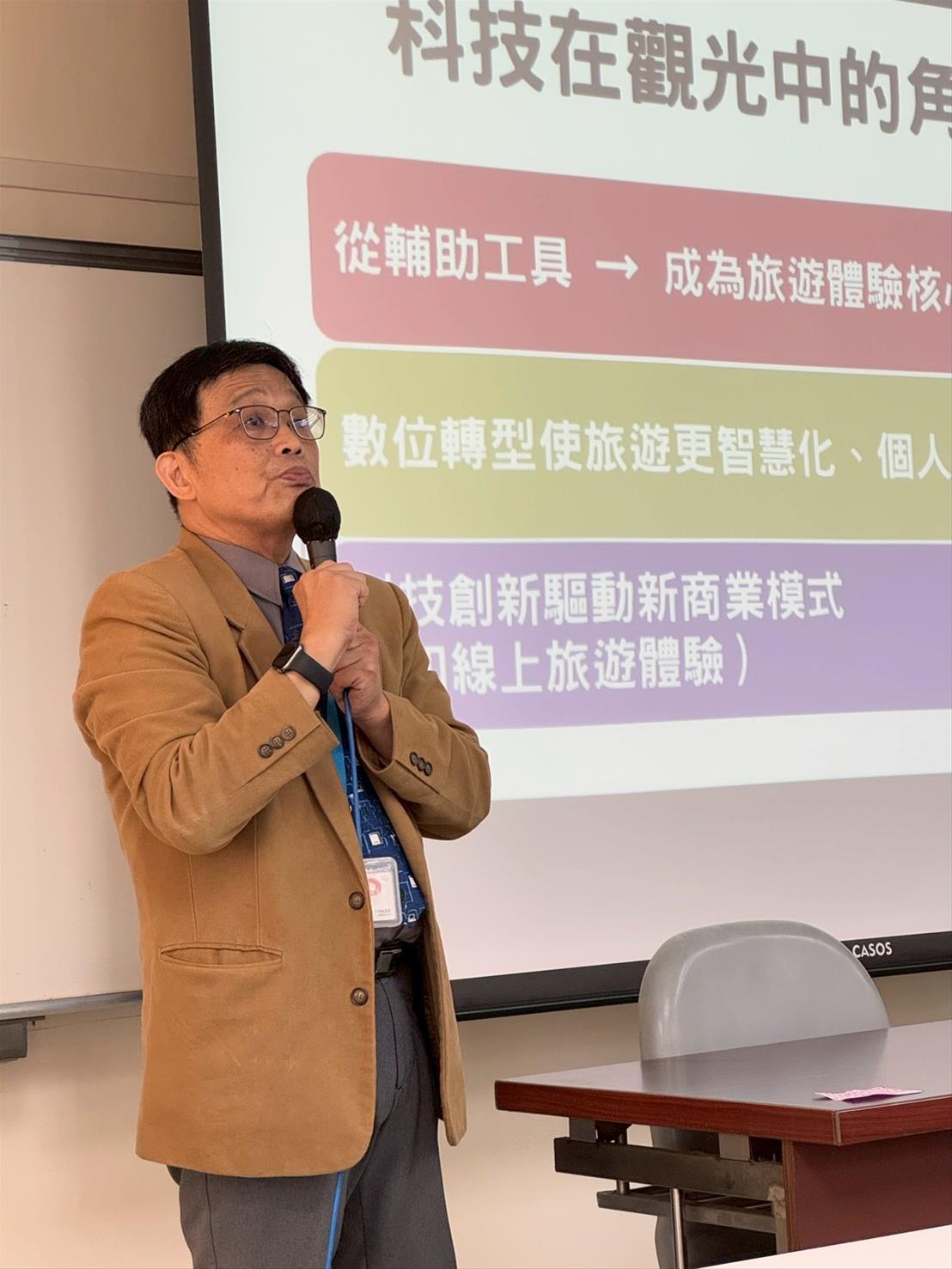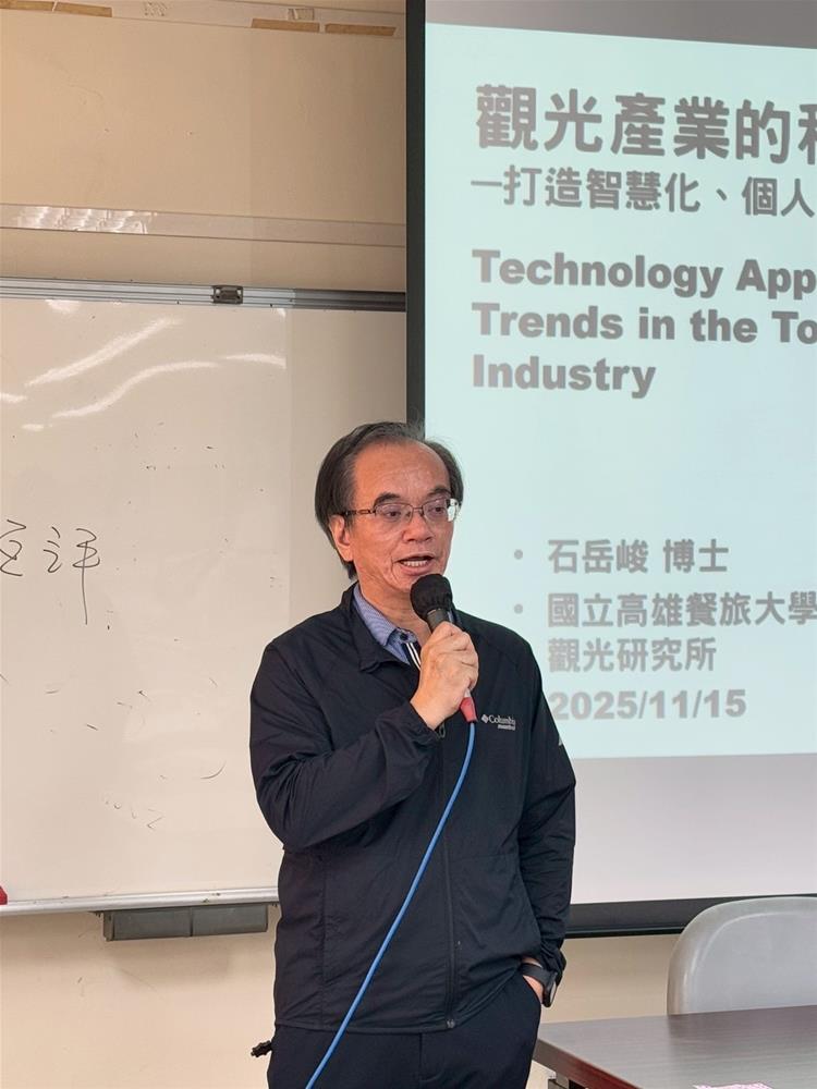 本系於 114 年 11 月 15 日(六)在 C302 教室舉辦專題講座,邀請國立高雄餐旅大學觀光研究所石岳峻所長分享觀光科技的最新發展,現場參與踴躍,氣氛熱烈。