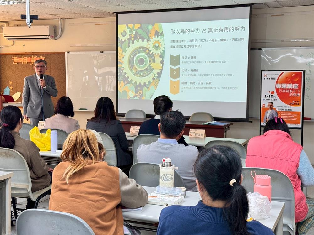 本系於115年1月10日舉辦專題演講,邀請傑出校友、越南精密集團(VPIC Group)副總裁暨僑務委員吳明穎,以「行李箱裝不下的商機—越南生活與創業趣事分享」為題,分享其25歲赴越打拚、走出舒適圈的跨國奮鬥歷程。吳副總裁以親身經驗說明海外發展的挑戰與機會,並強調制度化管理、文化理解與長期堅持的重要性,勉勵學生重視學習與累積,培養國際視野與實務能力,現場反應熱烈。