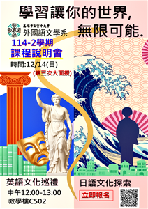 【外國語文學系公告】 114-1學期第3次網路教學到校面授課程(大面授)辦理【114-2學期課程說明會】 活動時間:114 年 12 月 14 日 星期日 中午 12 點至 13 點 活動地點: