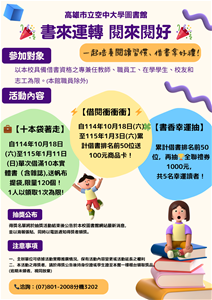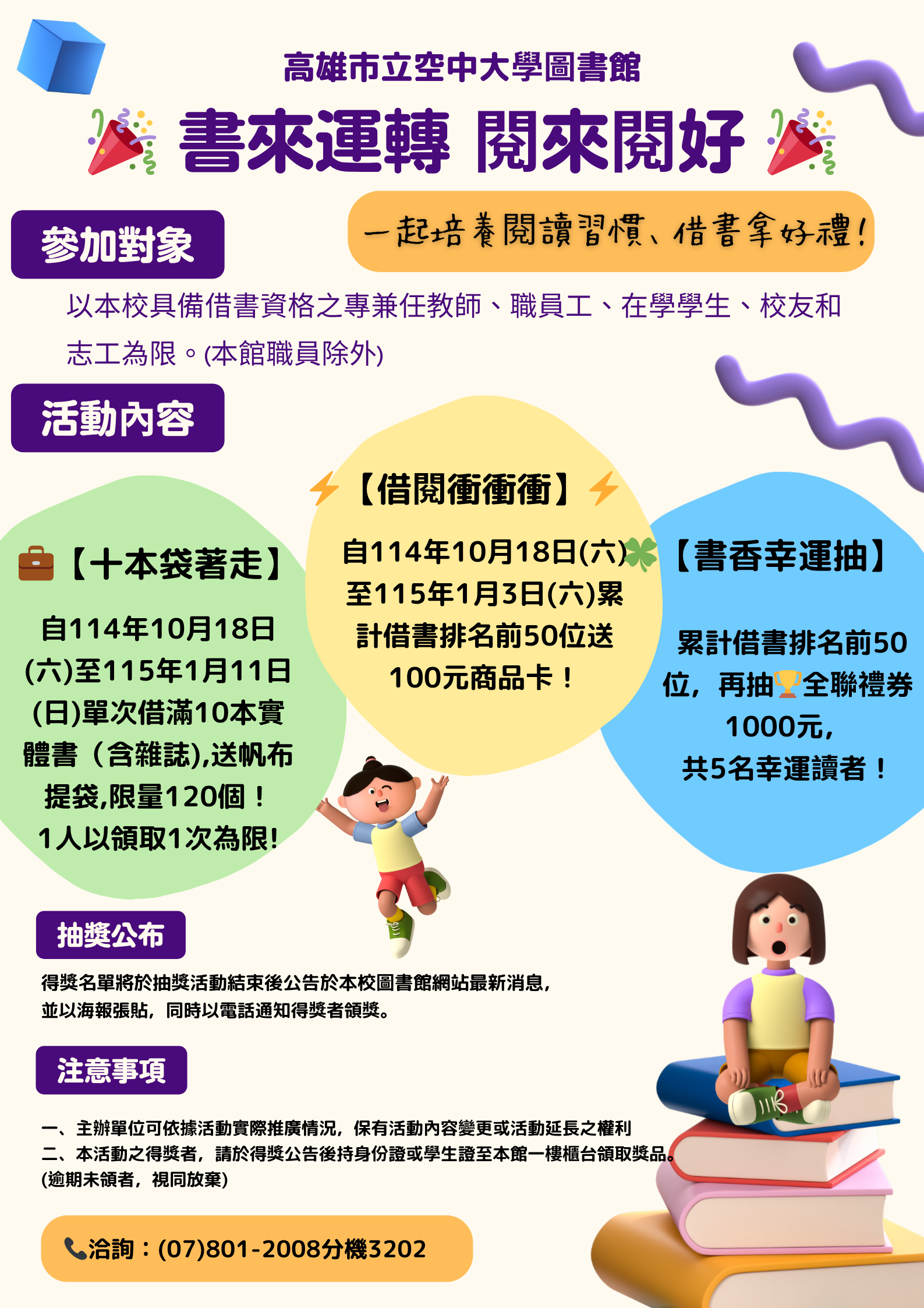 為鼓勵師生培養閱讀習慣,提升圖書利用率與校園閱讀風氣,圖書館今(114)年度規劃「書來運轉 閱來閱好」閱讀推廣活動,鼓勵教職員生、校友和志工等,多多借閱本校圖書館的實體書籍,讓閱讀不僅是知識的累積,更成為師生生活中愉快的日常,並增進圖書館與使用者的互動。