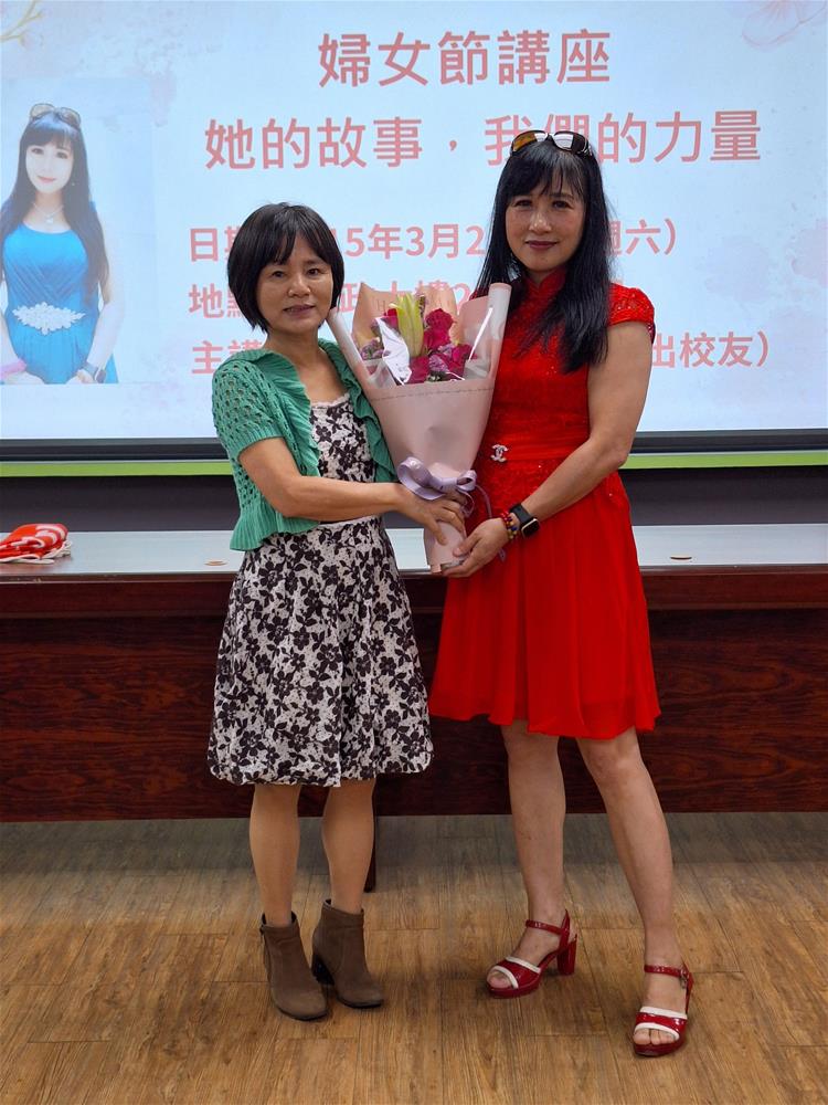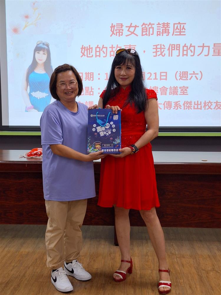 大傳系廖琼如系學會會長代表贈送禮品予江秀敏系友