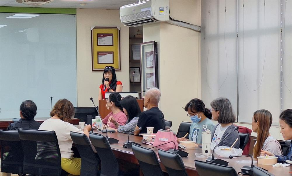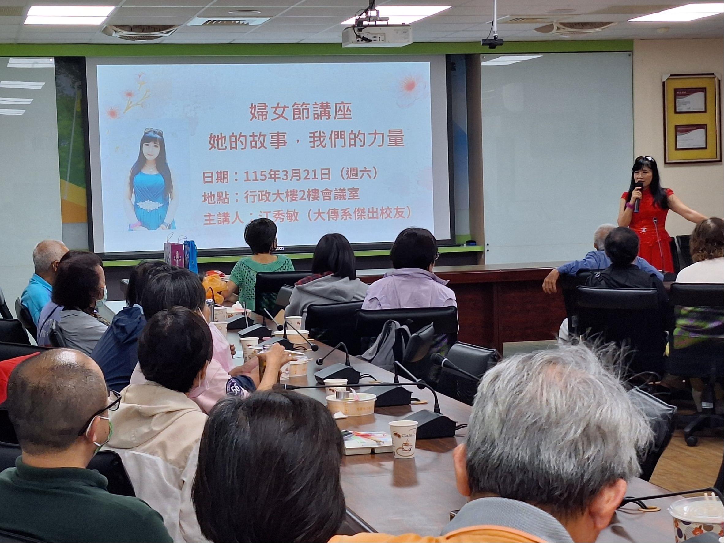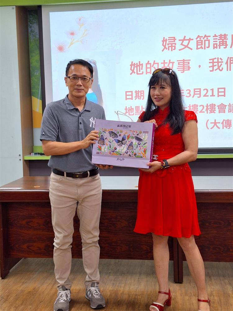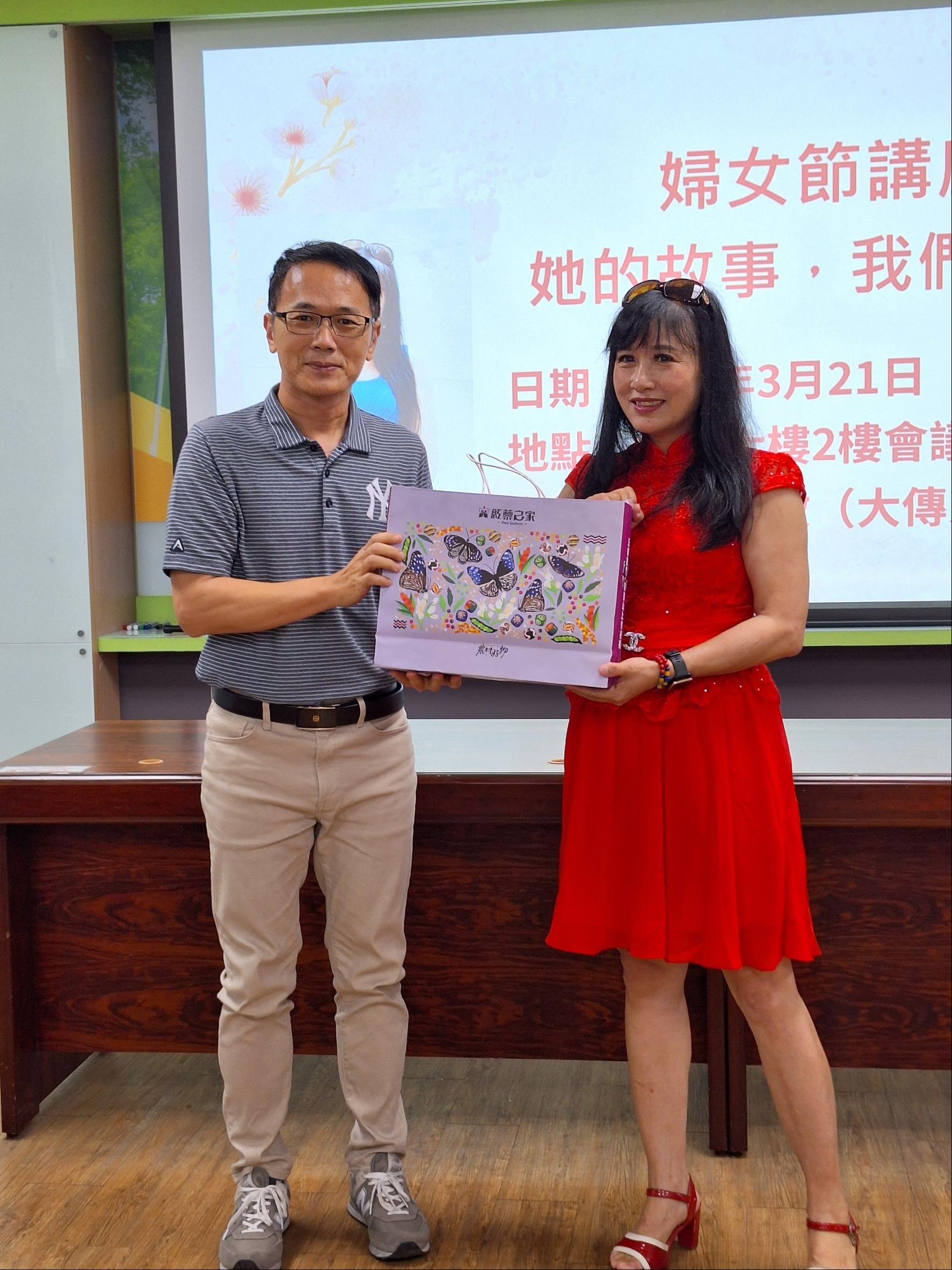 大傳系楊鈞賀主任代表贈送禮品予江秀敏系友