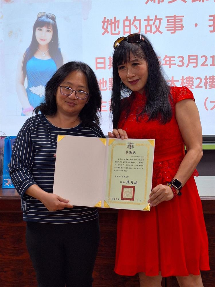 輔導處林柏每處長代表頒贈感謝狀予江秀敏系友