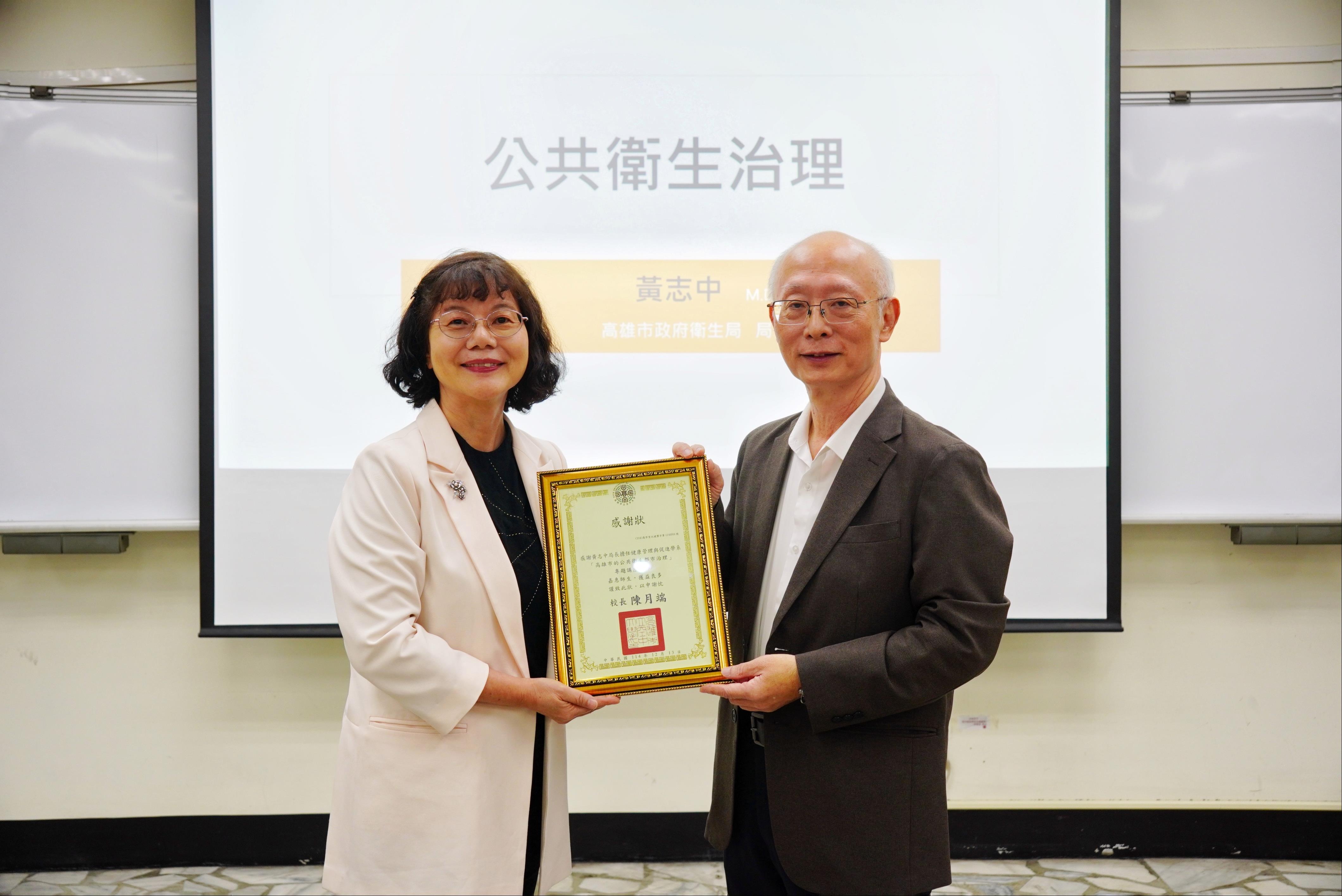 圖1 高雄空大校長陳月端(左)致贈感謝狀予高雄市政府衛生局局長黃志中(右)