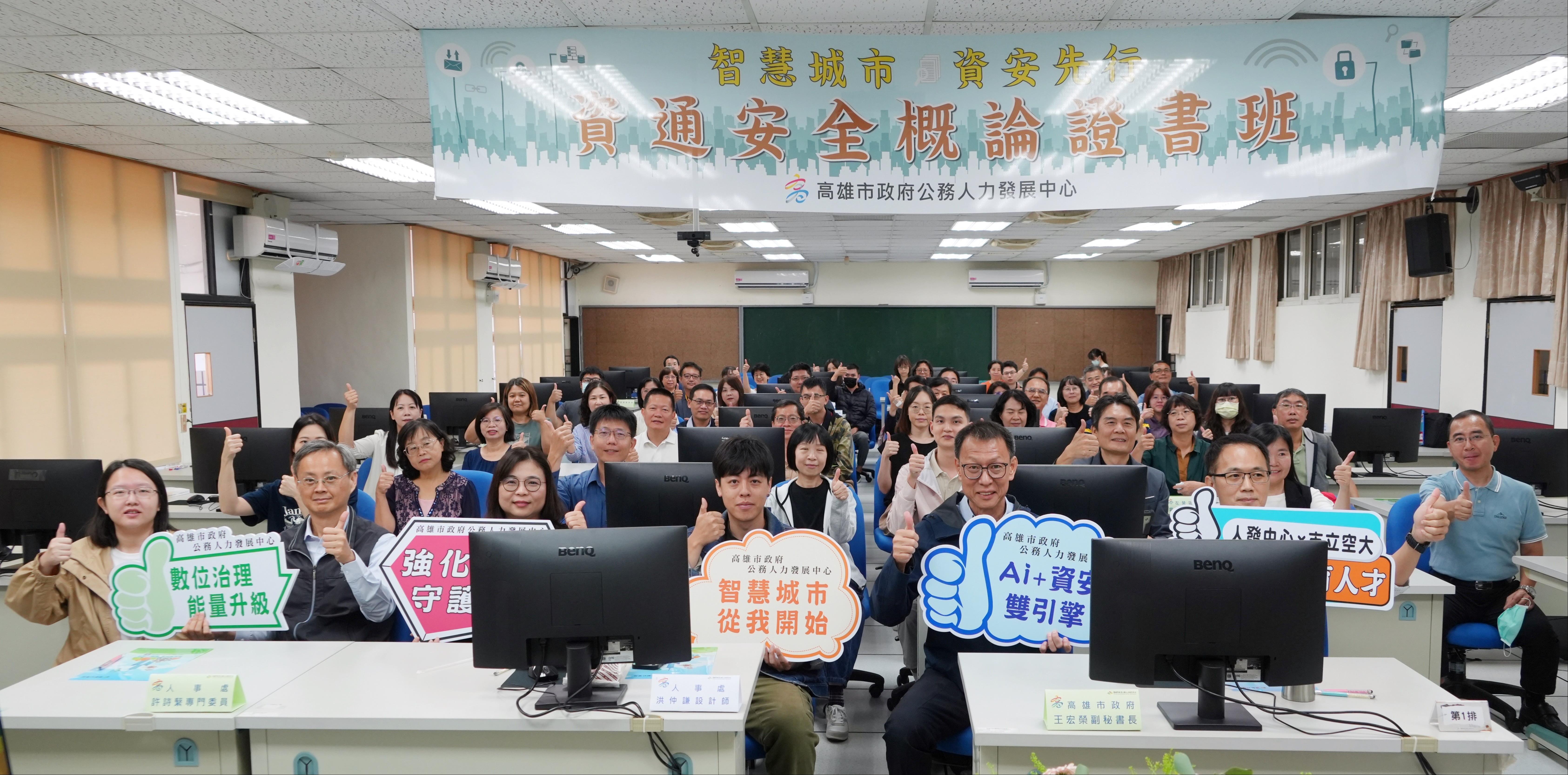 高雄空大與高雄市政府公務人力發展中心合作開辦「資通安全概論」專班共有兩梯次,首梯次於今(4)日正式開班。高雄市政府副秘書長王宏榮、研考會主任秘書郭榮哲、人事處專門委員許詩蘩、政風處副處長王俊凱、資訊處處長劉俊傑及人發中心張雅閔主任等親臨開訓典禮,充分展現市府團隊對資安教育的高度重視。