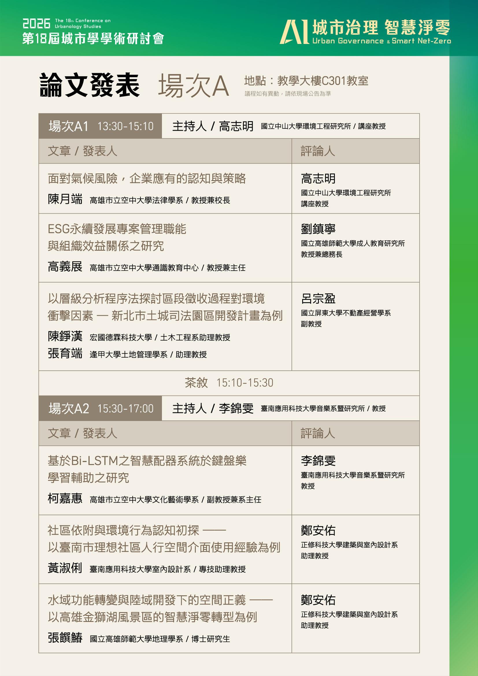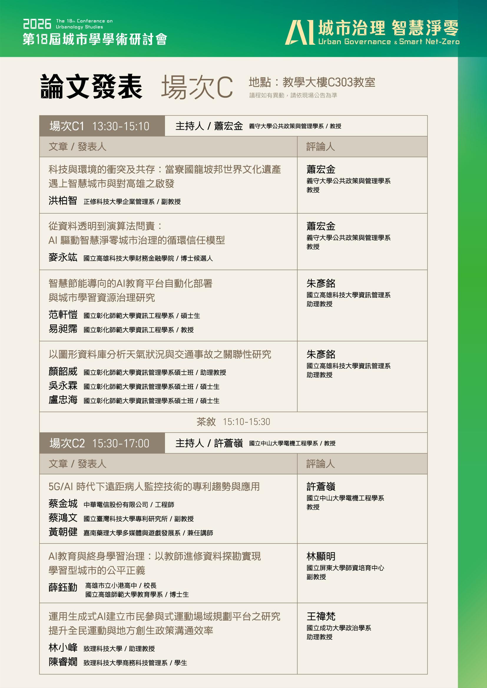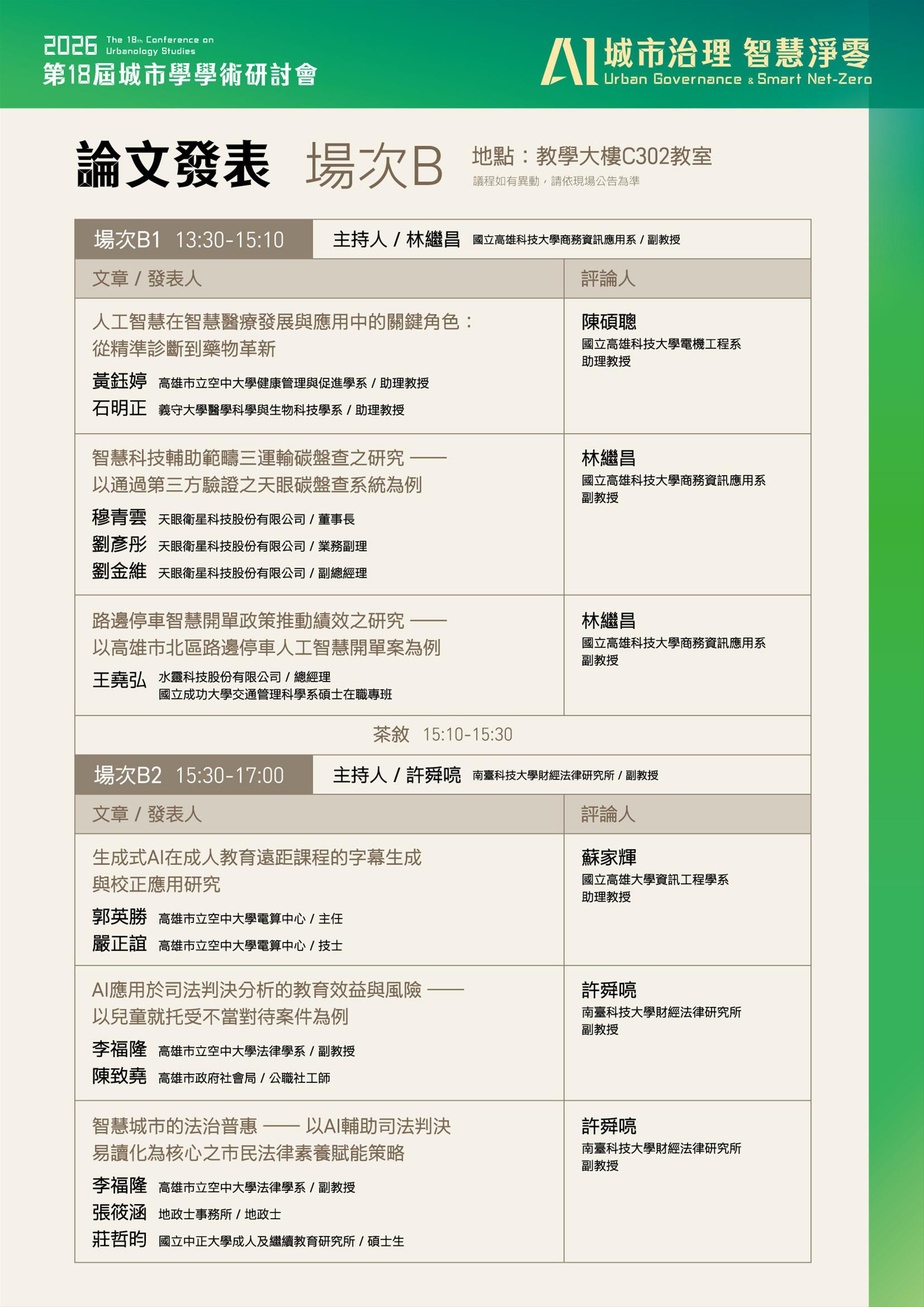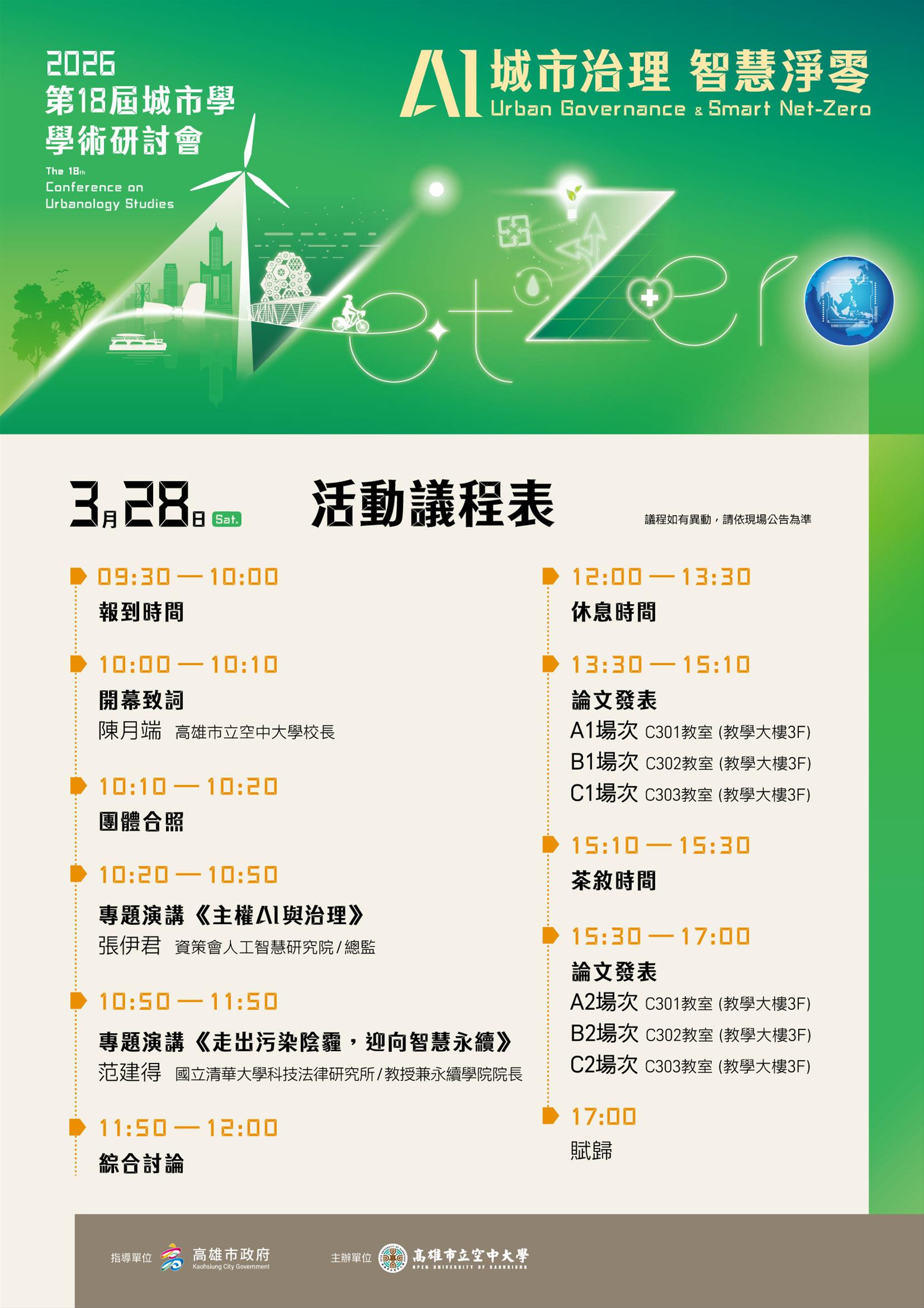 三、研討會時間:2026年3月28日(六)09:30-10:00報到;10:00開幕式;10:10-12:00專題演講(特邀請主講者/題目✔ 張伊君 總監(資策會人工智慧研究院)|『主權AI與治理』;✔ 范建得 教授(國立清華大學科技法律研究所兼永續學院院長)|『走出污染陰霾,迎向智慧永續』,蒞校進行專題演講);下午論文發表13:30-17:00