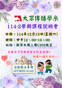 【大眾傳播學系】114-1學期第三次大面授12/13(六)舉辦本系「114-2學期課程說明會」