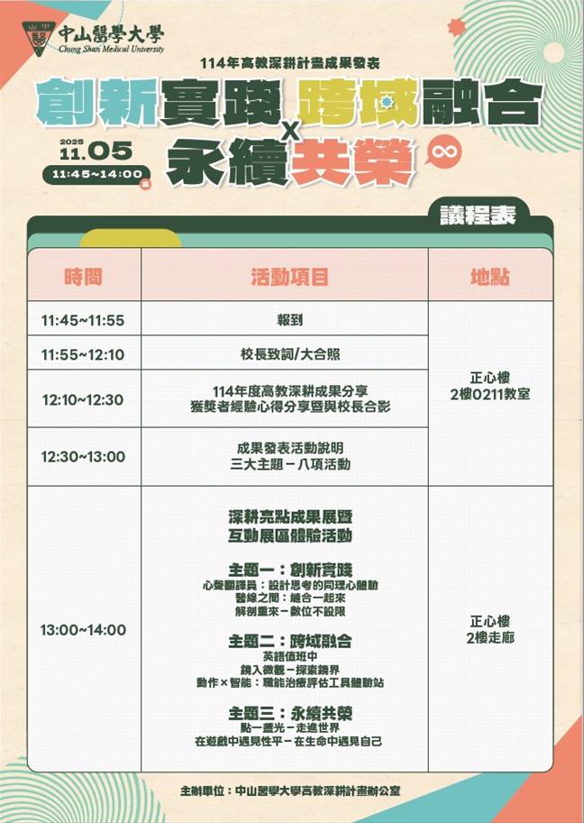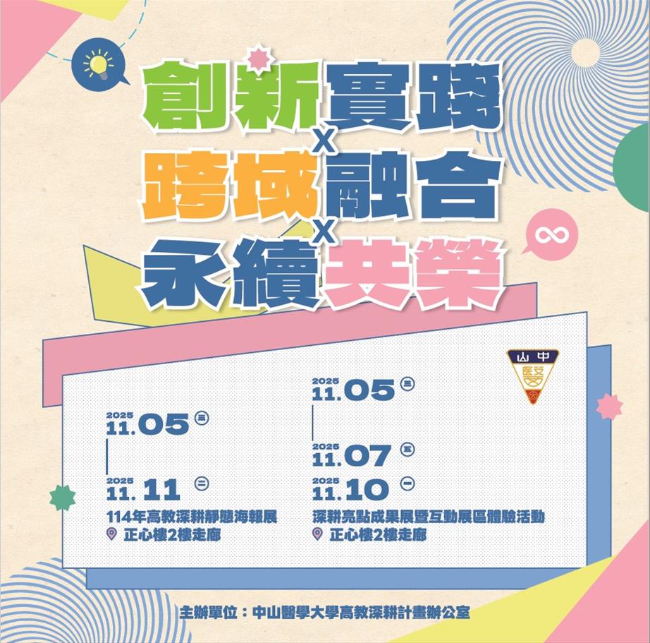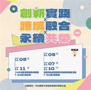 一、中山醫學大學執行教育部高教深耕計畫,於114年11月5日(三)至11日(二)辦理年度成果展,將今年度的四大面向:「教學創新精進」、「善盡社會責任」、「產學連結」、「提升高教公共性」之執行成果與各校分享交流。