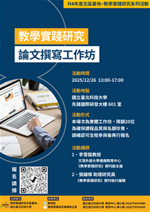 主旨:教學實踐研究計畫北區基地謹訂於114年12月26日(五)辦理「教學實踐研究論文撰寫工作坊」工作坊,敬邀貴校教師踴躍報名參加。