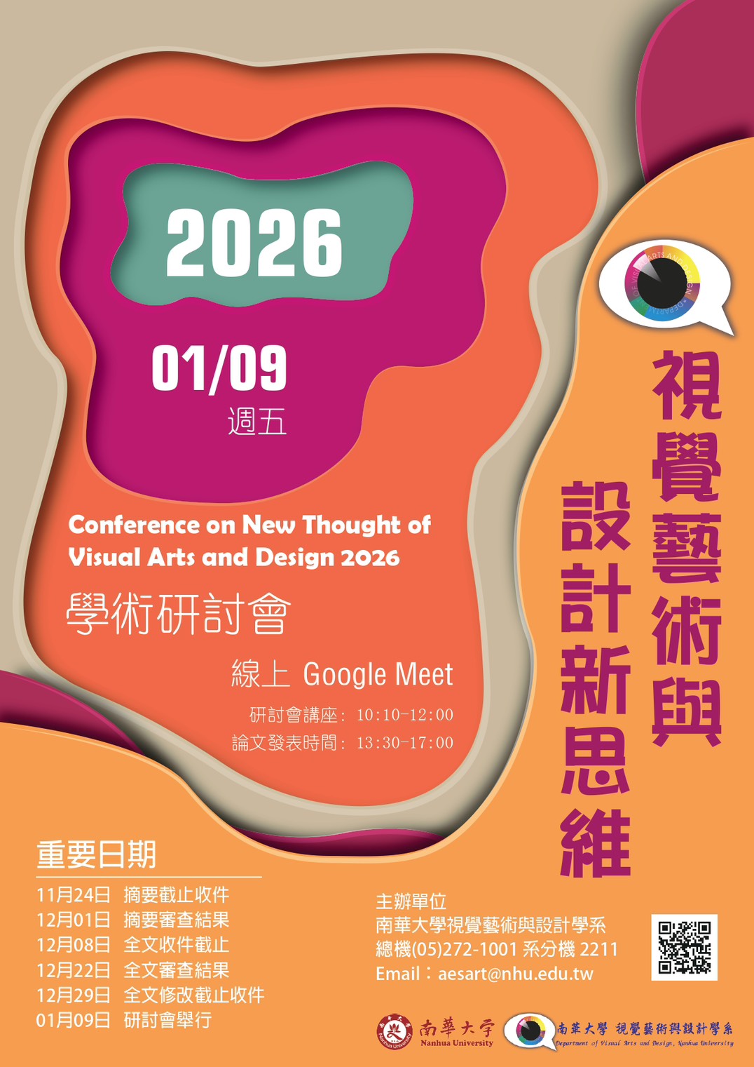 南華大學視覺藝術與設計學系辦理「2026視覺藝術與設計新思 維學術研討會」,請惠予公告並鼓勵貴校師生踴躍賜稿及 投件,請查照。