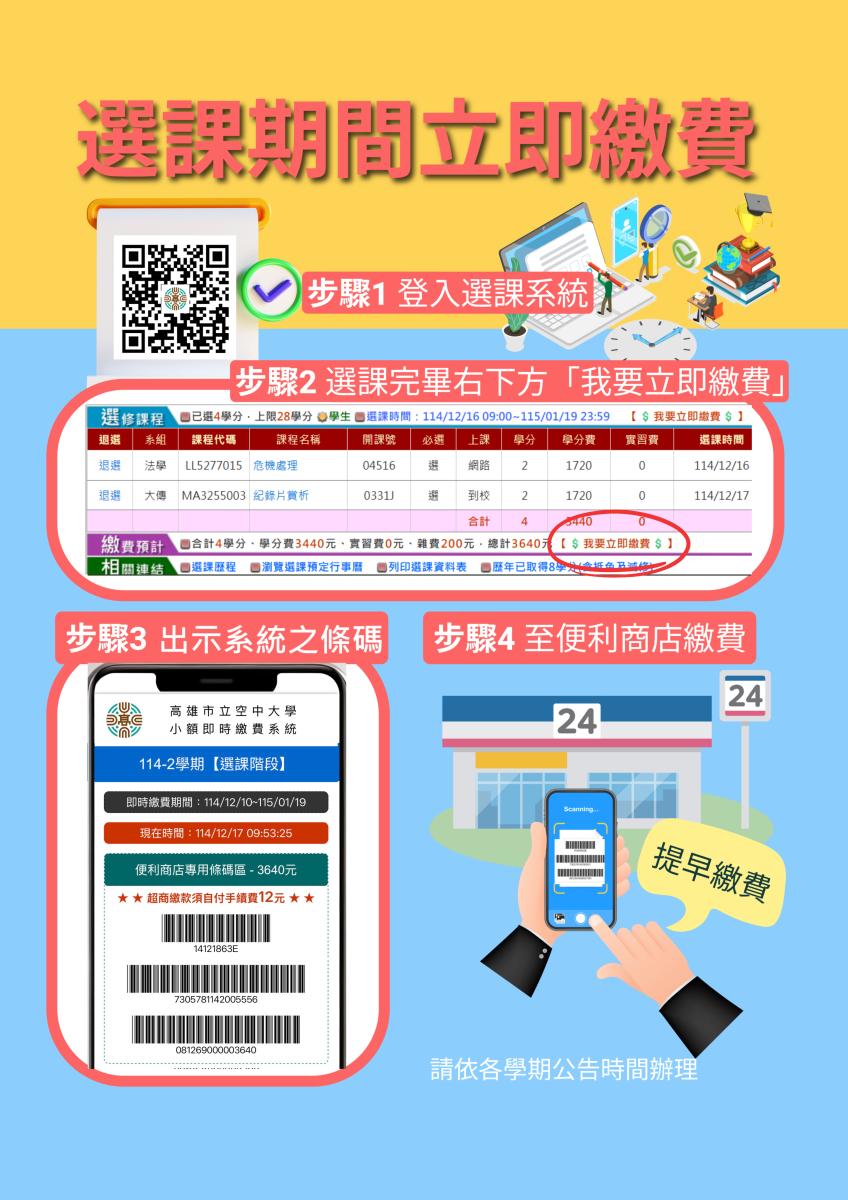 114-2學期選課完畢,於選課畫面右下方【我要立即繳費】,可產出條碼至超商繳費(手續費12元)。