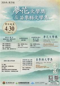 二、活動目的:為鼓勵文學創作,保存地方文學並傳承文史,苗栗縣政府賡續辦理2026年「苗栗縣第29屆夢花文學獎暨苗栗縣文學集」徵選,徵選項目如下: