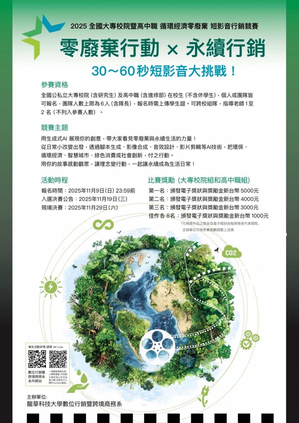 二、活動宗旨:在全球追求永續發展的浪潮下,零廢棄不再只是環保概念,而是行動與創新的實踐。透過生成式AI的加入,影像創作與數位行銷具備前所未有的表現力,使永續理念能以更具感染力的方式被傳遞與推廣。本競賽旨在鼓勵大專校院與高中職學生發揮創意策劃、影音製作與數位敘事能力,運用生成式AI技術,結合零廢棄理念,製作出兼具創新性與社會影響力的短影音行銷作品。