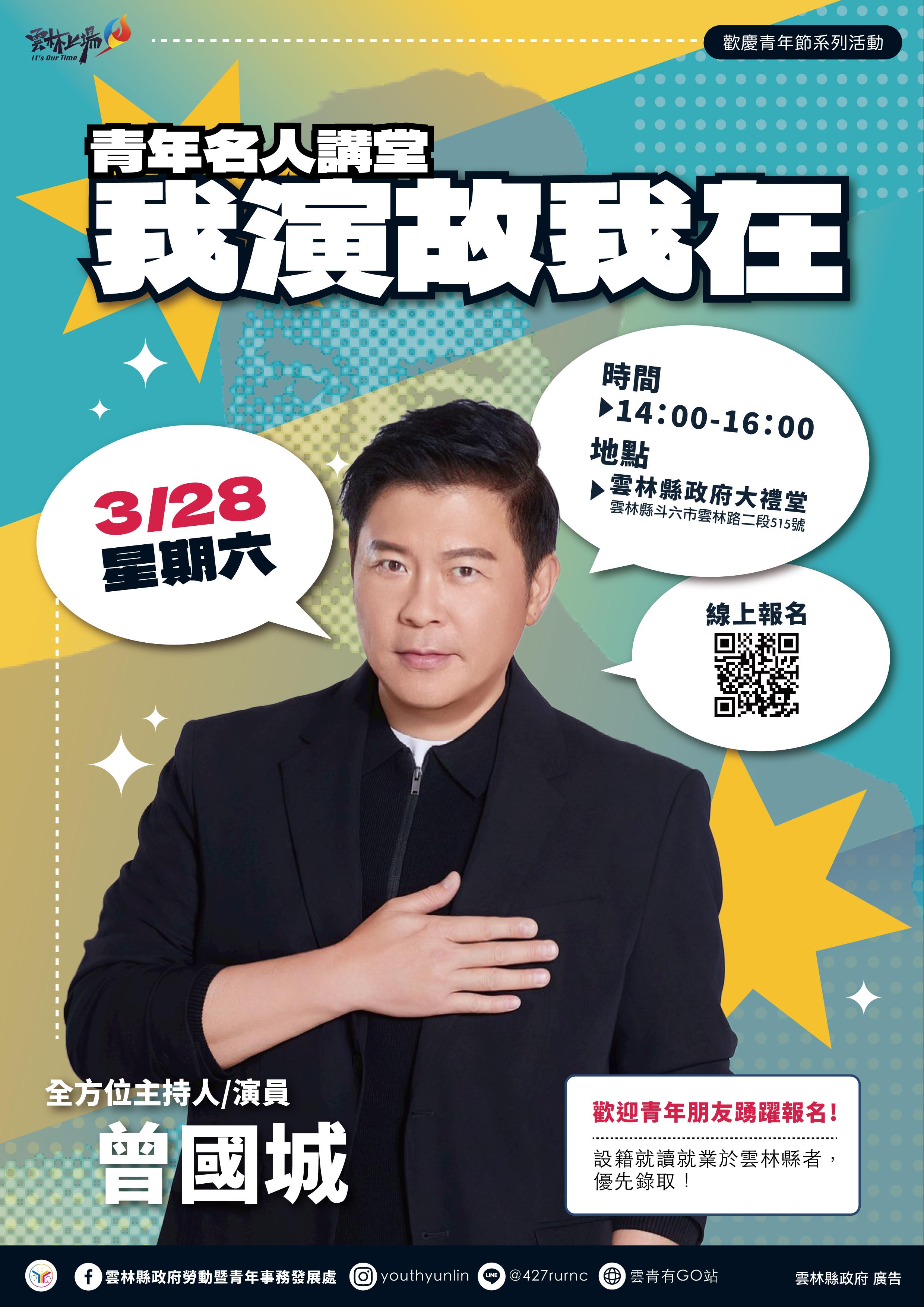 1.活動主題:我演故我在。青年名人講堂係聚焦於百工百業有成人士自身領域的生活故事;本次邀請「金鐘主持人─曾國城」,分享職涯奮鬥的人生劇本。