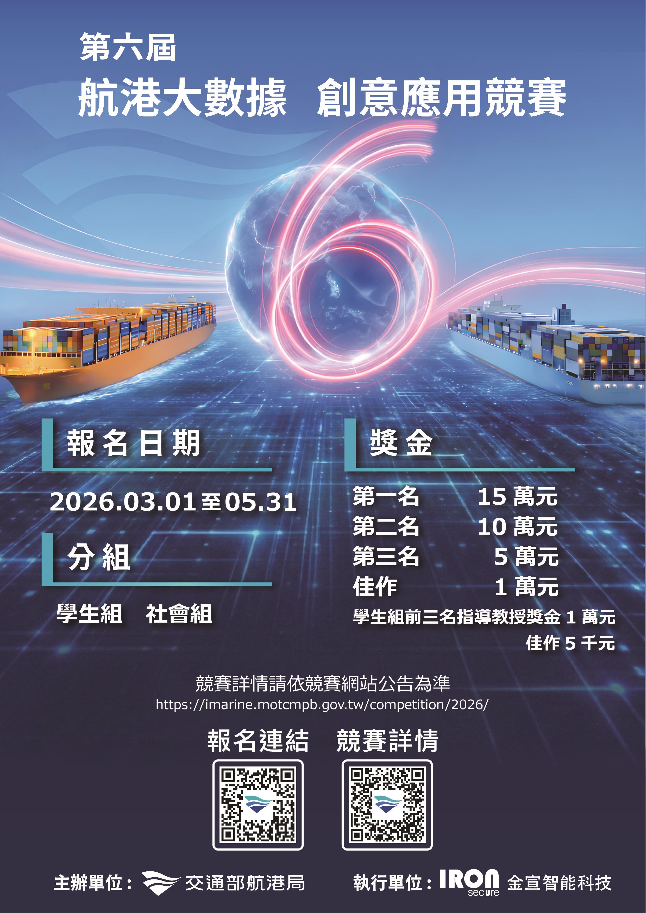 二、活動目的 : 交通部航港局「iMarine航港發展資料庫」蒐整豐富的航港資訊,並以視覺化及易讀的方式呈現,帶給使用者一站式且便捷的資料查詢服務。為充分發揮資料庫價值,交通部航港局透過舉辦 「第6屆航港大數據創意應用競賽」,鼓勵各界將資料庫之數據資料,進行更深入的加值應用,提出契合航港實務需求的方案,進一步促進航港產業永續發展。
