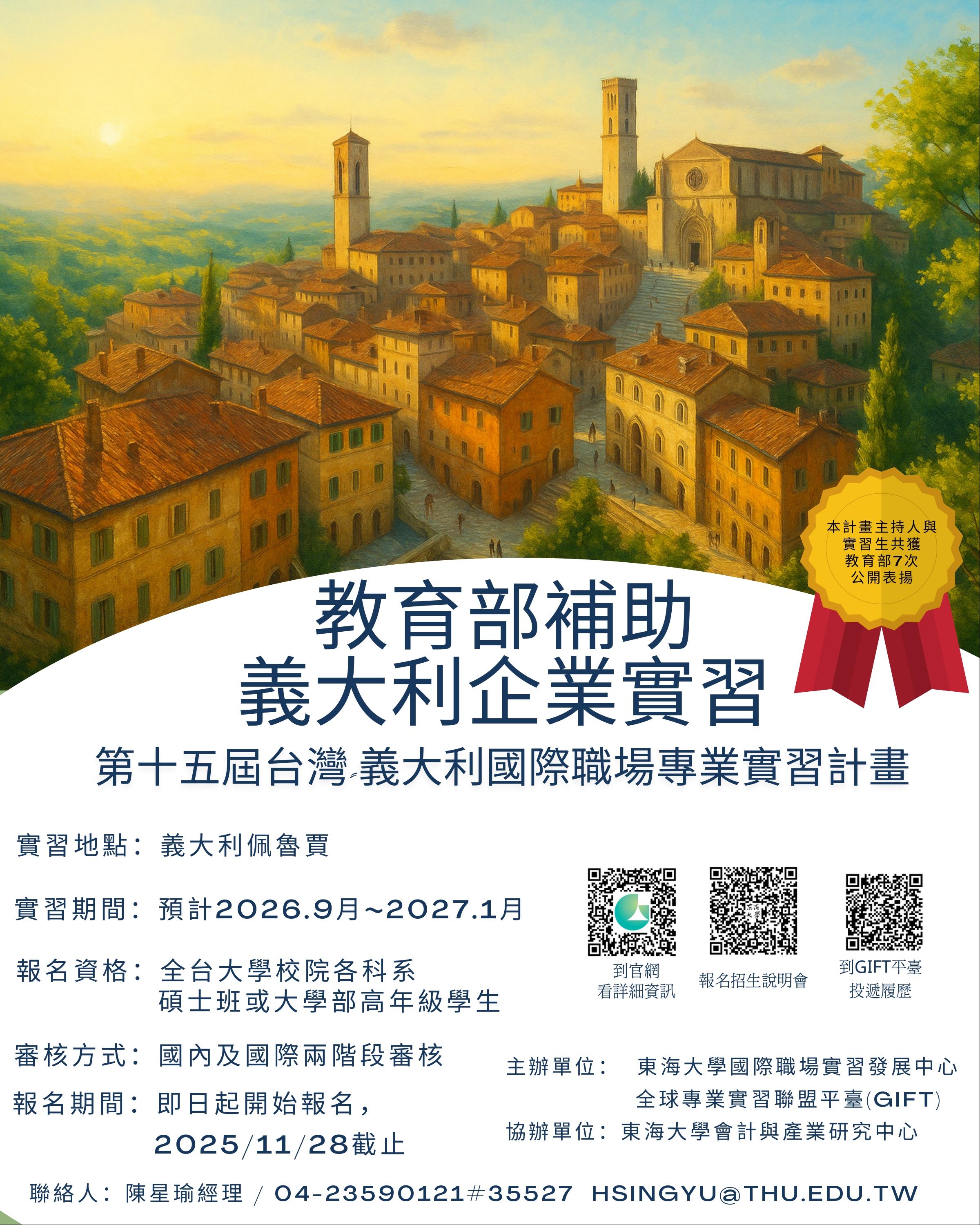 【轉知】第十五屆台灣-義大利國際職場專業實習計畫