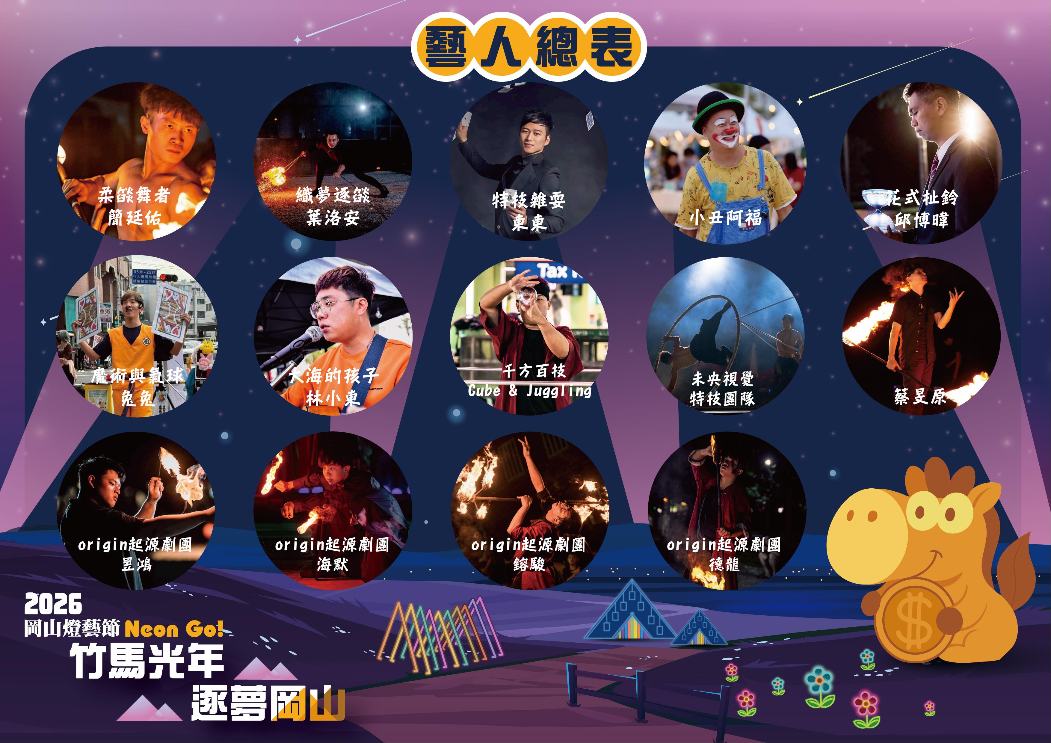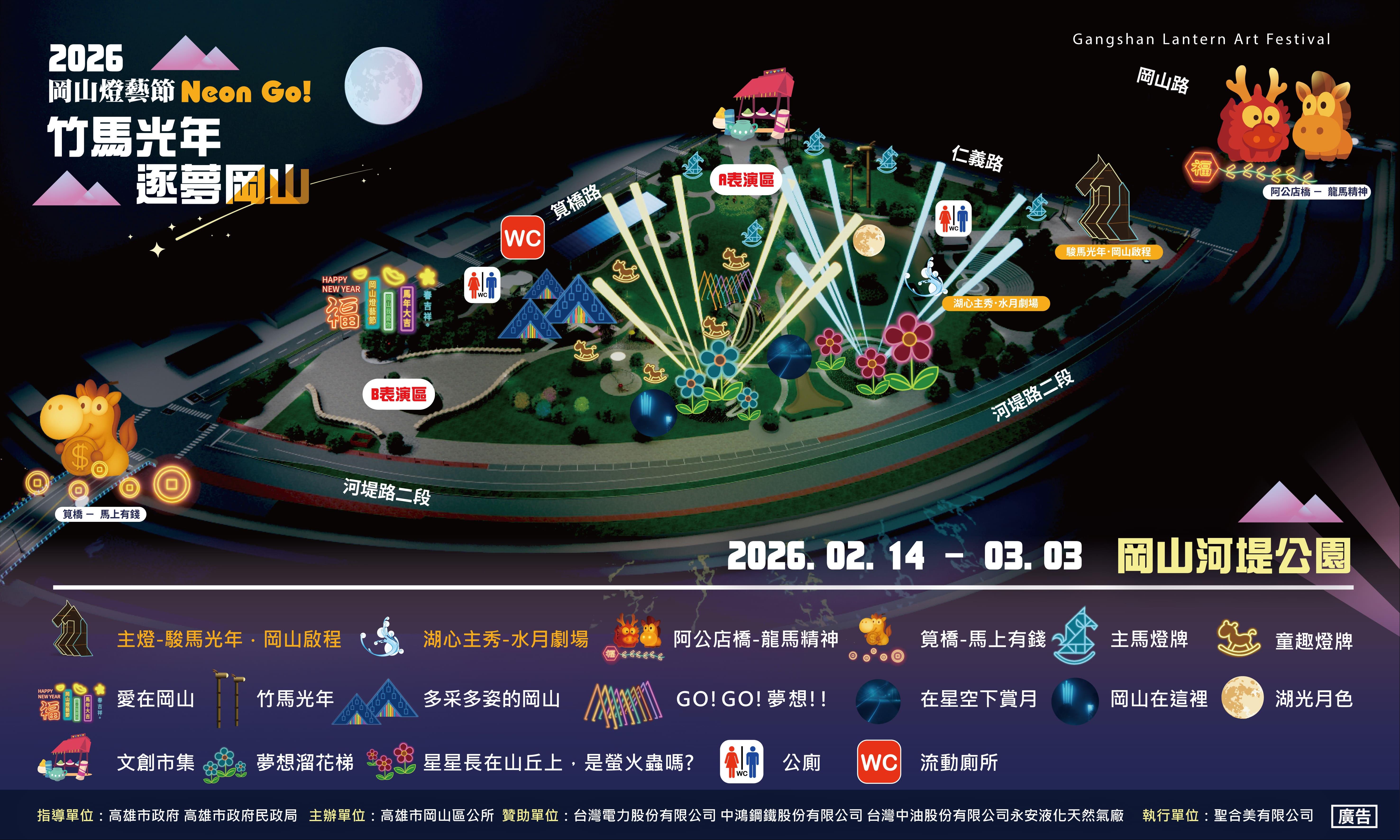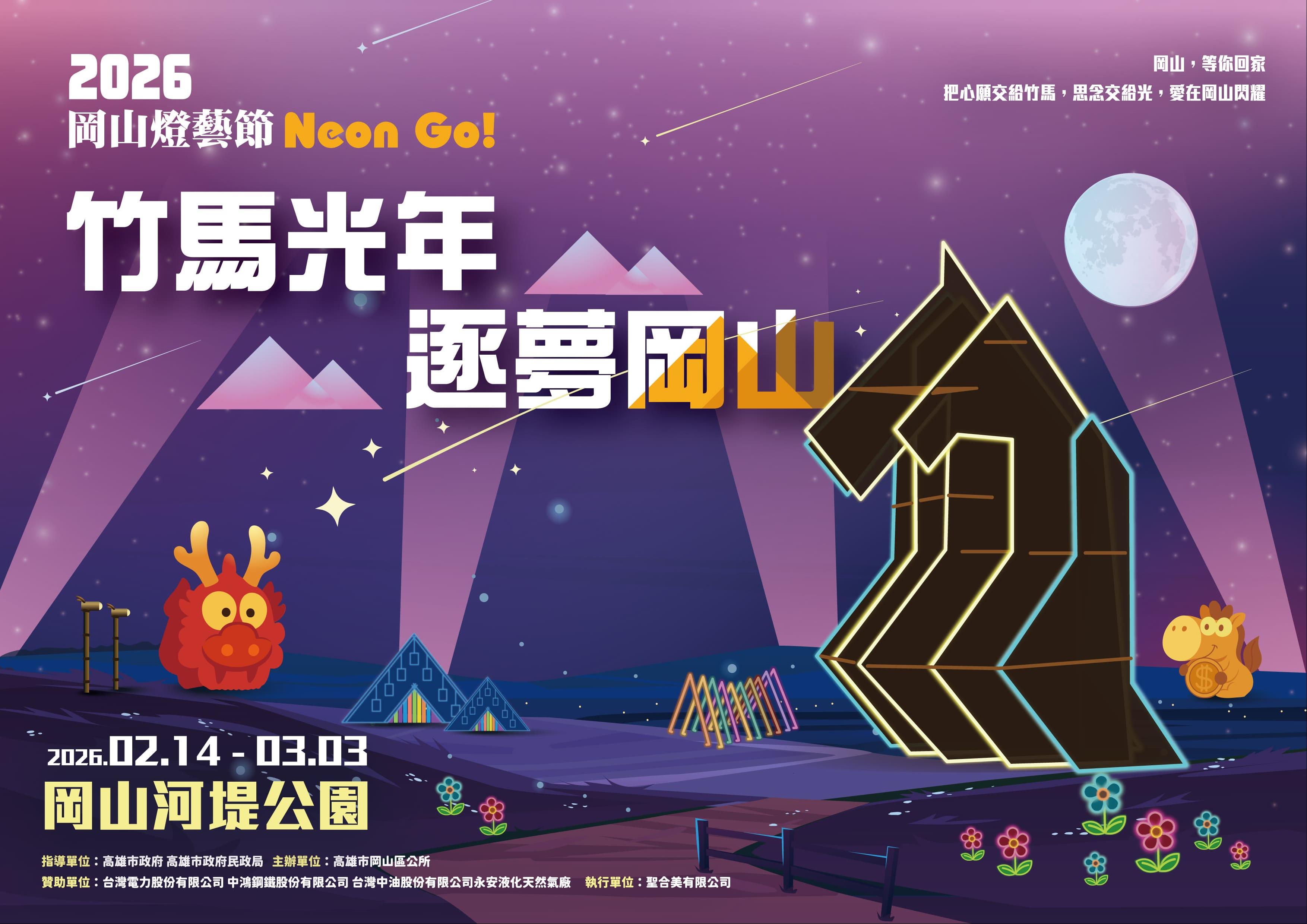 一、活動目的:岡山燈藝節為岡山區農曆年節期間最具指標性的年度觀光活動,今年以「竹馬光年・逐夢岡山」為主題,結合地方特色與新銳文創元素,透過光設計與裝置藝術融入自然環境,打造具有在地文化與藝術性的夜間觀賞體驗,讓在地居民及外地遊子於新春時節一同感受濃厚年節氣氛與燈藝魅力。