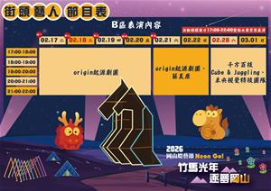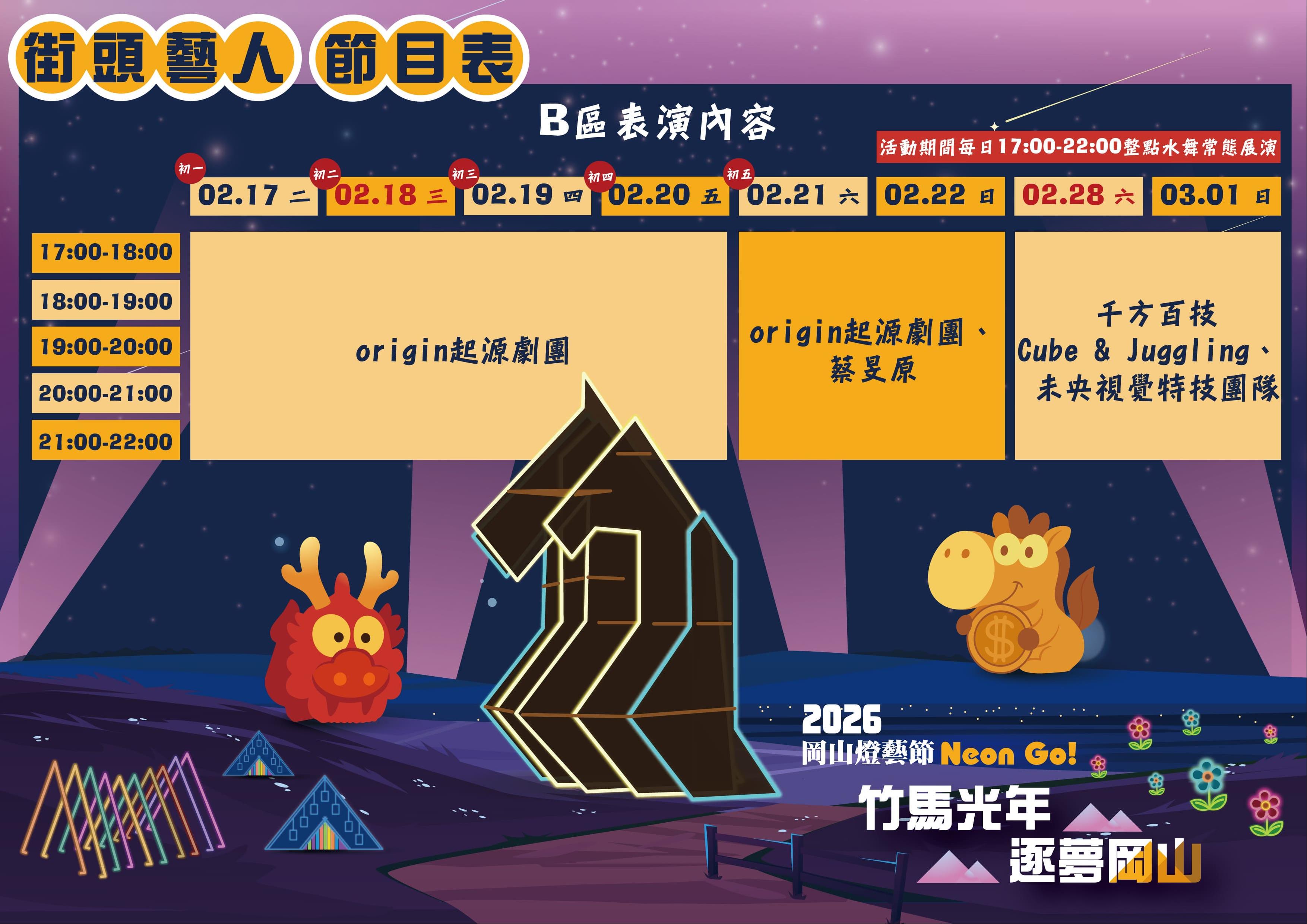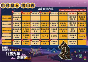 2.街頭藝人表演:2月17日(二)至2月22日(日)、2月28日(六)至3月1日(日)17時至22時。